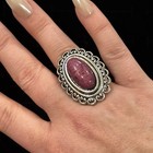 Adjustable Silver Tone Statement Ring Oval Purple Cabochon Scroll Design