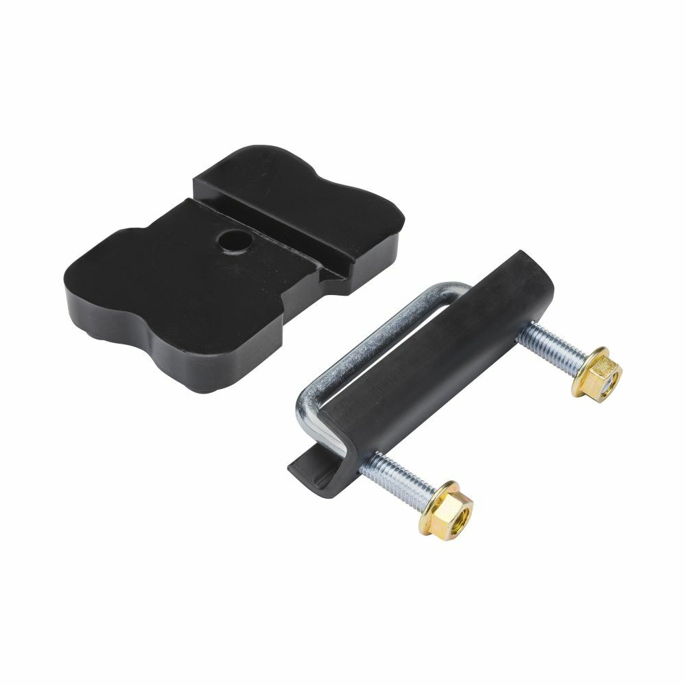 Mounting kits and poly spring pad mounting blocks are used as a fulcrum centered underneath SuperSprings. They sit on top of the factory spring pack assembly underneath the SuperSprings. They act to elevate, insulate, and anchor the SuperSprings to the factory spring assembly.