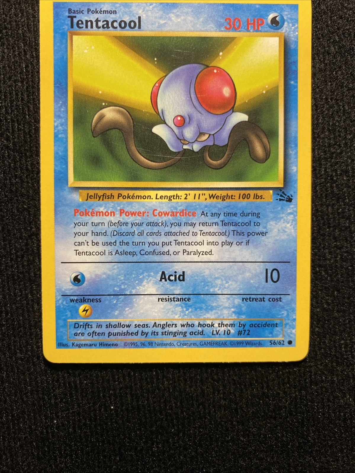 The Tentacool 56/62 Fossil Regular card is a common English-language Pokémon Trading Card Game card from the Fossil set. This basic stage card, with an HP of 30, features the Tentacool Pokémon illustrated by Kagemaru Himeno. Manufactured by The Pokémon Company, this unlimited edition card is part of the Pokémon TCG series and is a sought-after collectible for fans and players alike. AS IS NO RETURNS OR REFUNDS