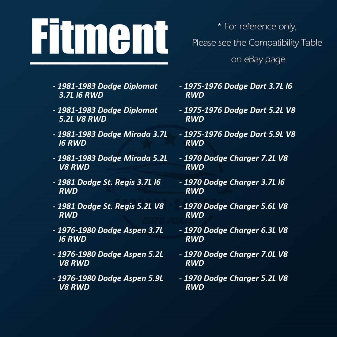 1981-1983 Dodge Diplomat(DriveTypeName:RWD) 1981-1983 Dodge Mirada(DriveTypeName:RWD) 1981 Dodge St. Regis(DriveTypeName:RWD) 1976-1980 Dodge Aspen(DriveTypeName:RWD) 1975-1976 Dodge Dart(DriveTypeName:RWD) 1970 Dodge Charger(DriveTypeName:RWD) 1978-1979 Dodge Challenger(DriveTypeName:RWD) 1969-1970 Dodge Coronet(DriveTypeName:RWD) 1969-1970 Dodge Monaco(DriveTypeName:RWD) Payment