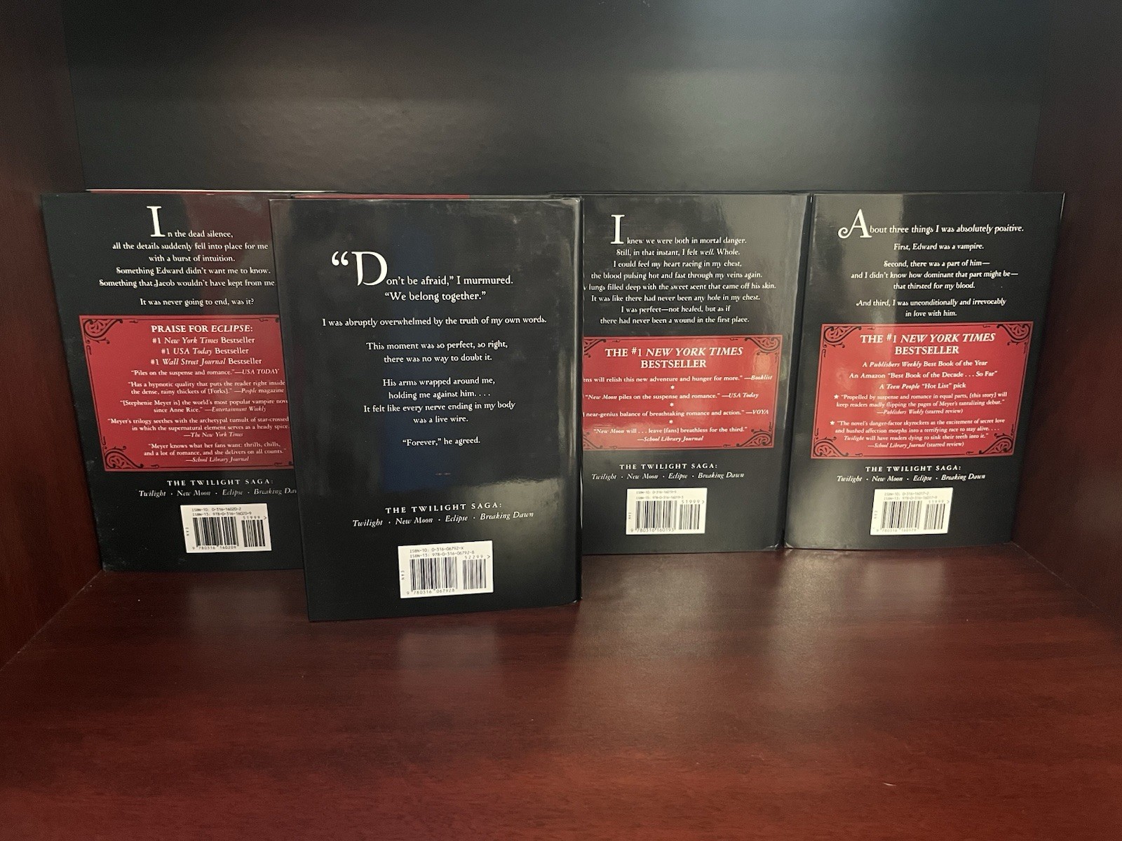 This complete collection of the Twilight saga is the first edition of this collection and are all hardcover. It includes Twilight, New Moon, Eclipse and Breaking Dawn. It also includes 3 of its 4 prints that came with this set upon release.