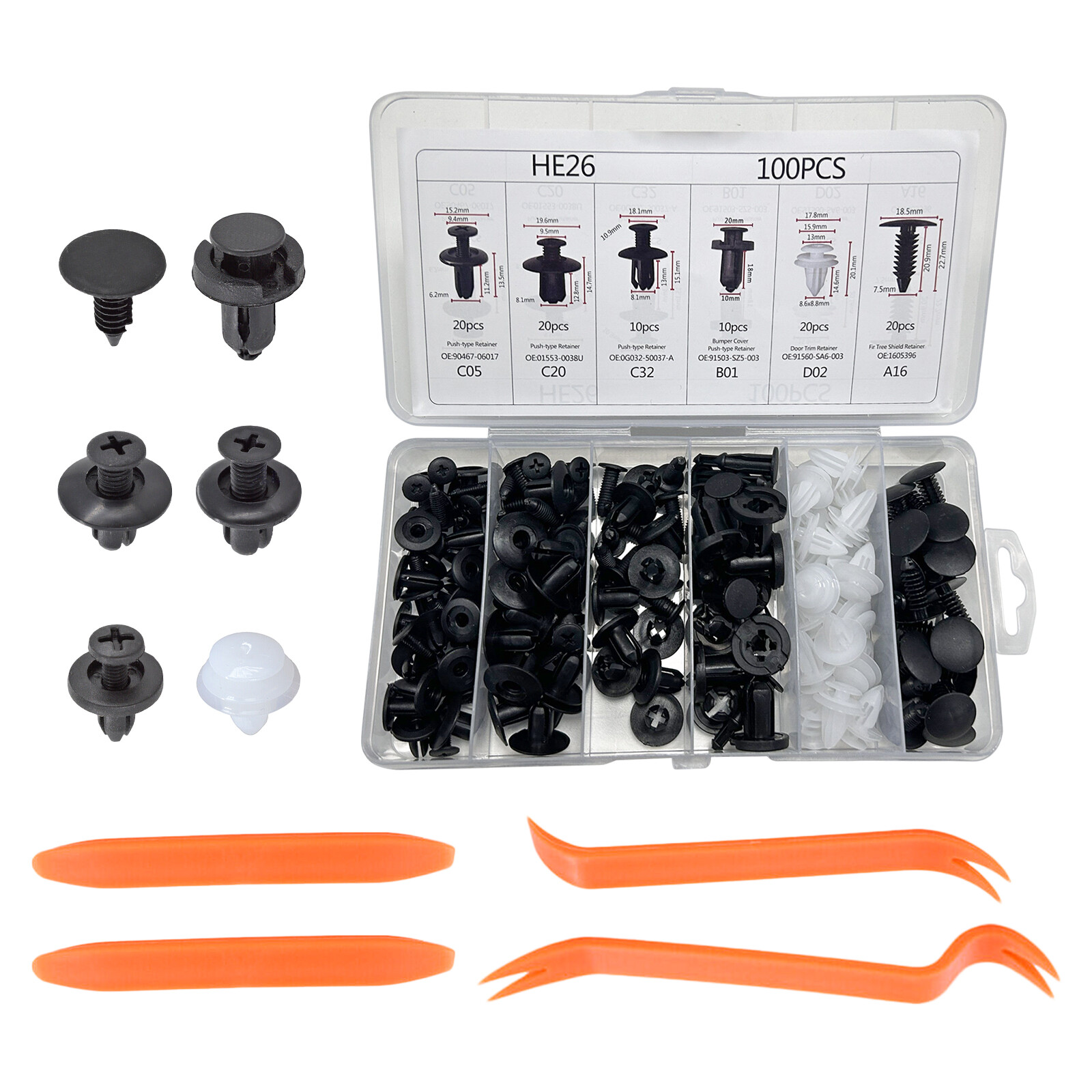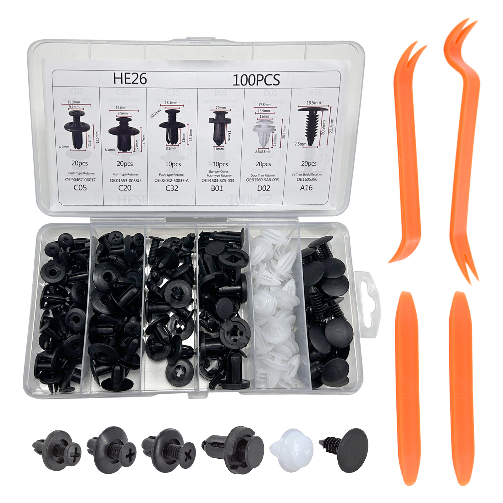 4. Package contains: 100 Pcs Automotive Push Type Retainer Kit (6 differnt sizes )with a nice plastic Storage Box and 4 fastener removal tools.