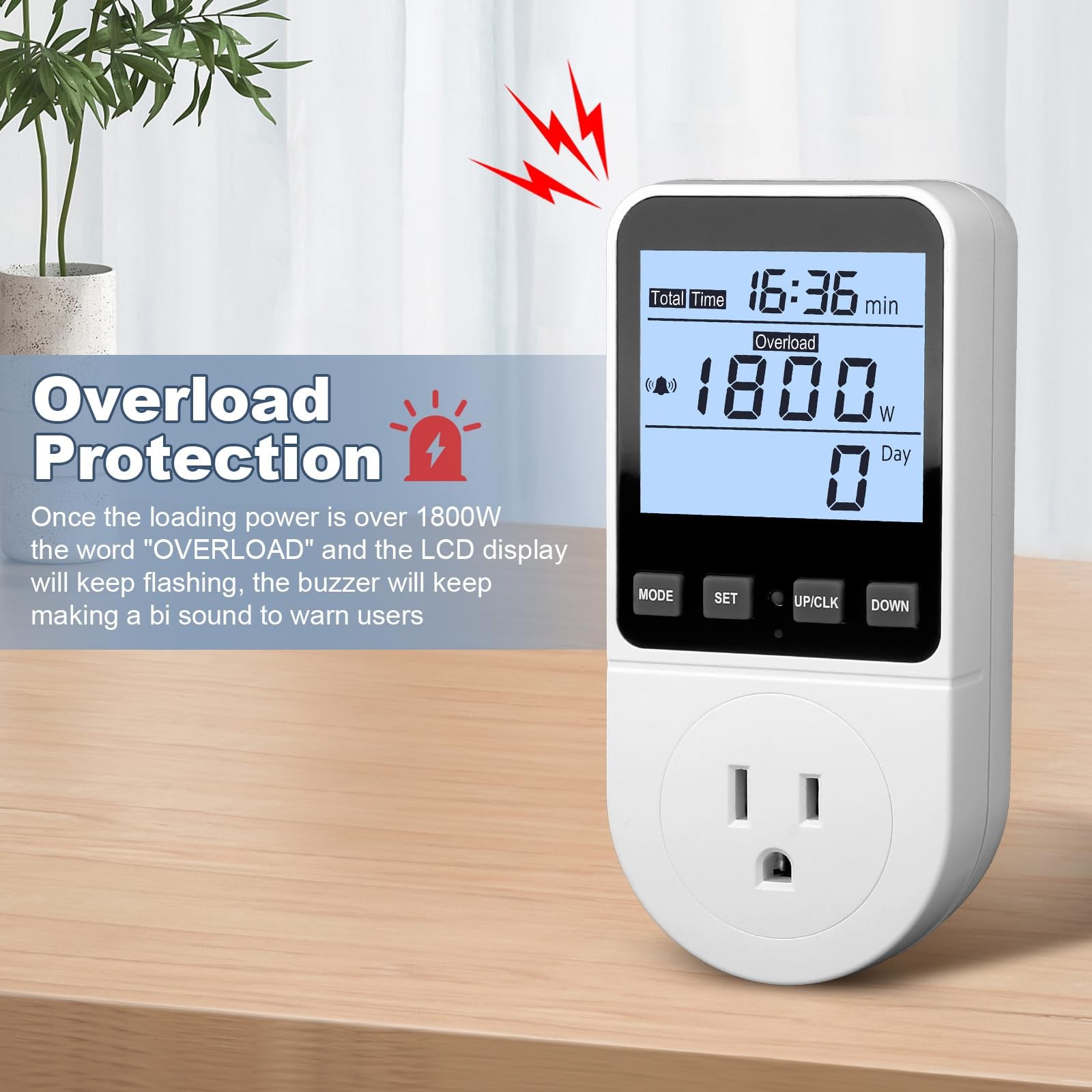 Overload Protection: When the power of the appliance exceeds the overload power, the word "OVERLOAD" and the LCD display will keep flashing, the buzzer will keep making a bi sound to warn the users. All the buttons will quit working and can only work again when the overload alarm has been cleared by raising the setting value or removing the appliance. The default overload power is 3680W and is adjustable from 0 to 3680W. In general, you need to set the overload power to 1800W before using. Just press the "MODE" button for more than 3 seconds to enter the setting.
