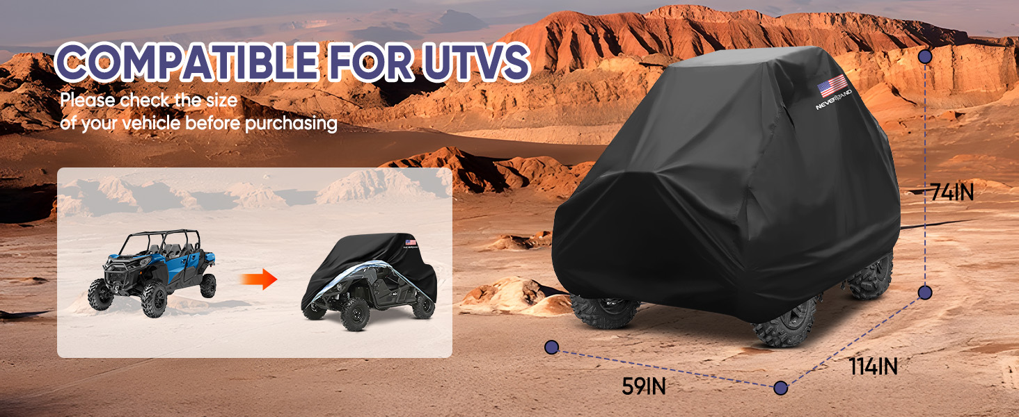 【CHECK YOUR UTV SIZE】Fit all UTV's. 114.17" x 59.06" x 74.80" (290*150*190cm). Our covers are compatible with polaris,rzr,ranger,canam,suzuki,honda,kawasaki,yamaha utv and more, (If you not sure your vehicle fit or not, please contact our customer service any time.)
