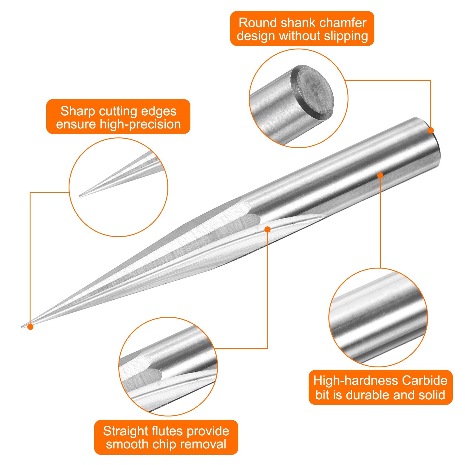 The engraving router bit is made of cemented carbide (tungsten steel), which has high hardness, strong impact resistance and wear resistance, is not easy to break or damage, and keeps the cutting work stable and smooth. The surface is polished, which not only improves the surface finish of the drill bit and enhances its corrosion resistance but also effectively reduces friction resistance and wear, thereby extending the service life of the cutting tool.V groove router bit with high-precision machining, fast cutting edges, mirror polishing, smooth cutting, clean, neat and burr-free surface; large chip flutes provide smooth and resistance-free chip removal, improving work efficiency; universal round shank chamfer design, tightening without slipping when clamping, convenient and quick to use.CNC router bits are suitable for hardwood, plywood, cork, MDF, PVC, oak, aluminum, plastic, stainless steel, titanium alloy and other material surfaces. You can use it to complete tasks such as engraving, carving, chamfering, drilling, milling, cutting, sign making, lettering, etc.To accurately match your needs, please try using a shorter cutting-edge tool. A cutting edge that is too long or a tool body that is too long can easily cause vibration and deflection during processing, resulting in tool damage or affecting processing quality.The CNC engraving bit is designed for portable or desktop woodworking engraving machines. Do not use it with other machines such as electric drills and drill presses.