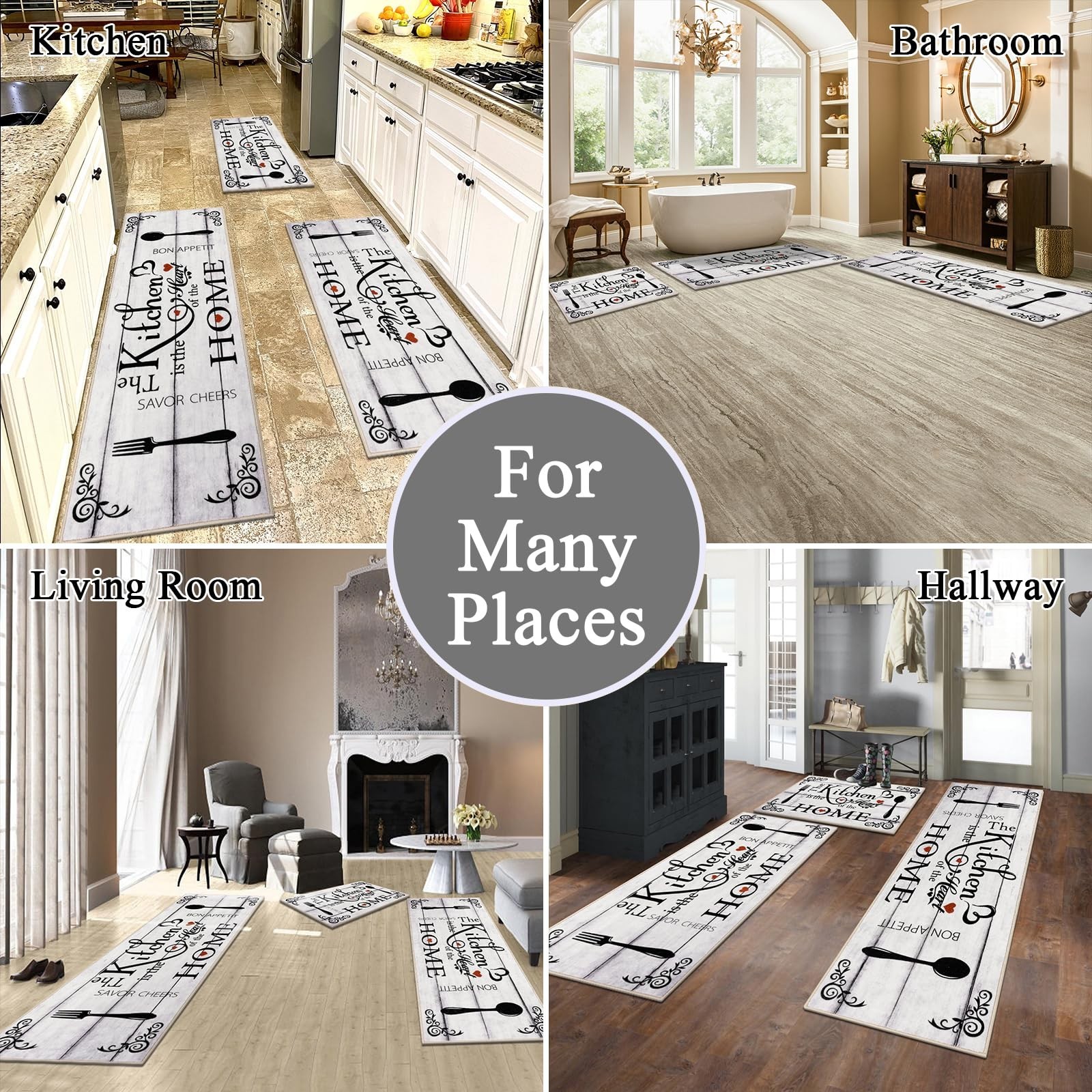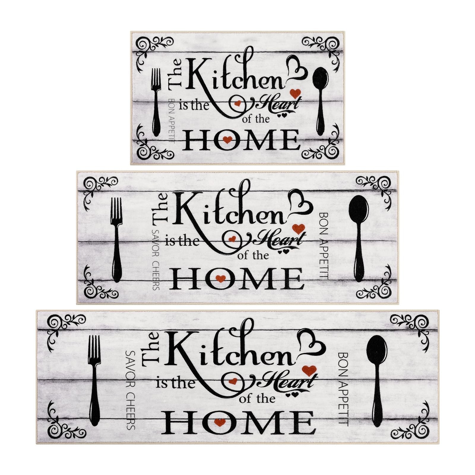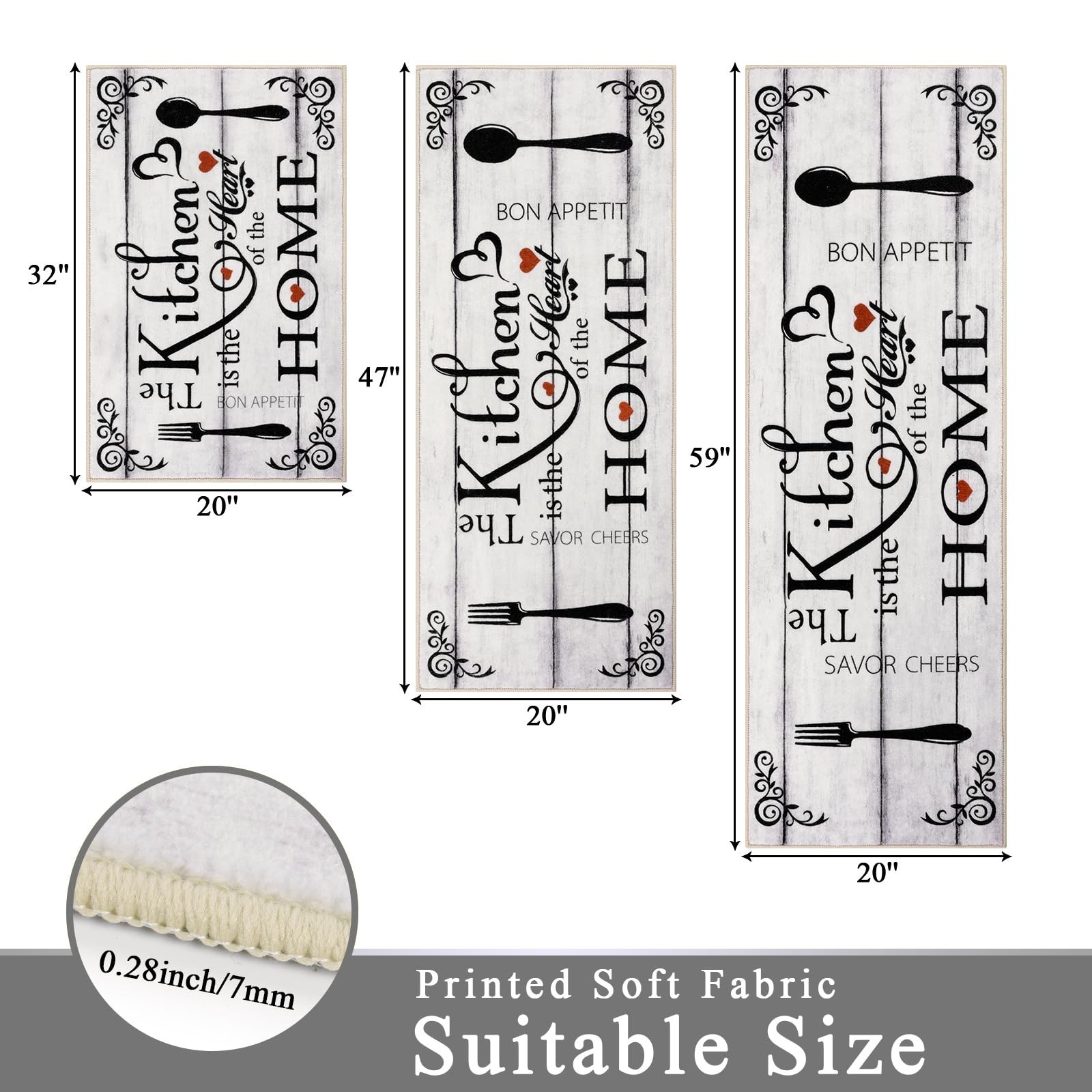 Kitchen Runner Rugs Sets 3 Pieces: Vaukki farmhouse kitchen rugs set measures 20"x32"+20"x47"+20"x59", which can better meet your needs for placing it. The machine washable kitchen rug is suitable for all types of large and small kitchens