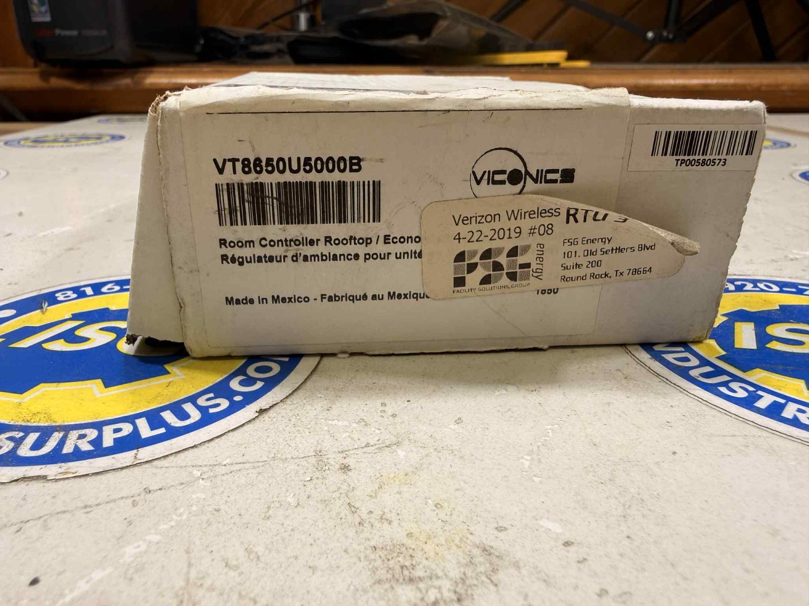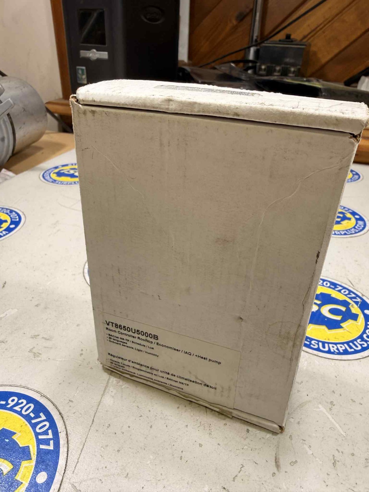 New surplus Viconics VT8650U5000B Room Controller from the VT8600 Series, designed for rooftop units, heat pumps, economizers, and IAQ control. Supports BACnet MS/TP communication and LUA programming. Equipped with integrated light and humidity sensors. Unit is unused; box shows shelf wear but the controller and documentation are clean and intact.
