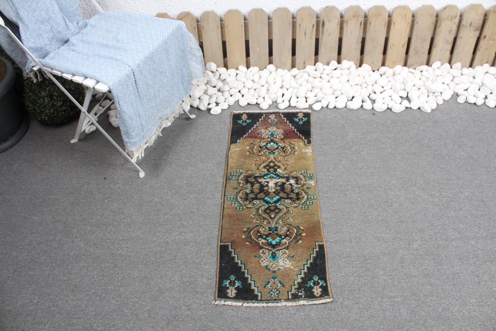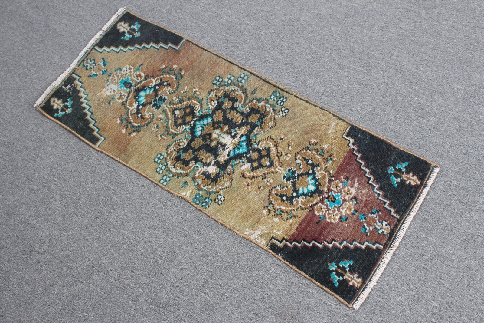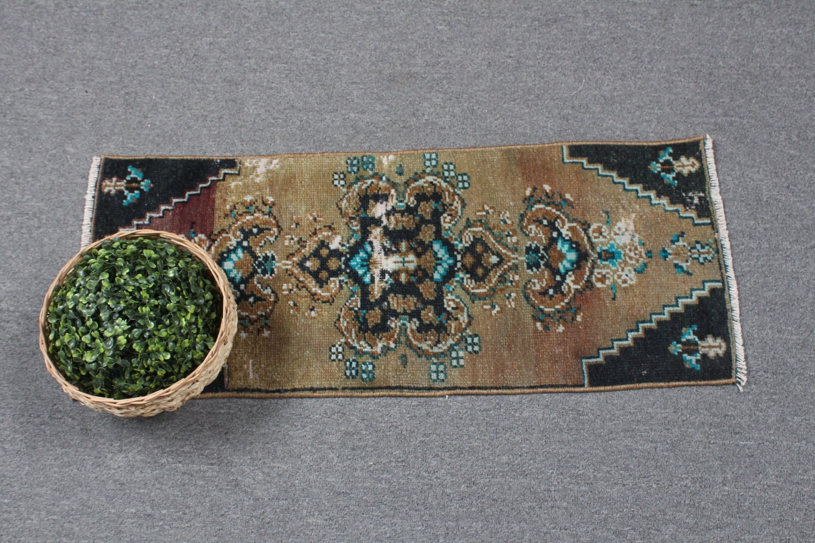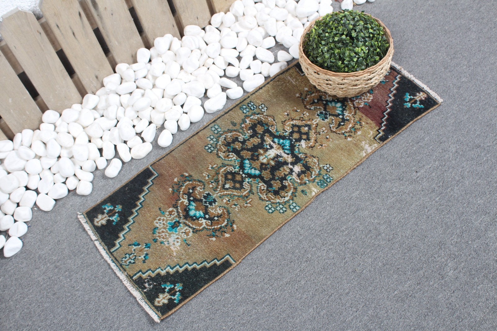 Intricately designed with a striking blend of green and black, this 2x9 ft vintage area rug captures timeless elegance. Its rich hues and patterns add a touch of sophistication to any room.