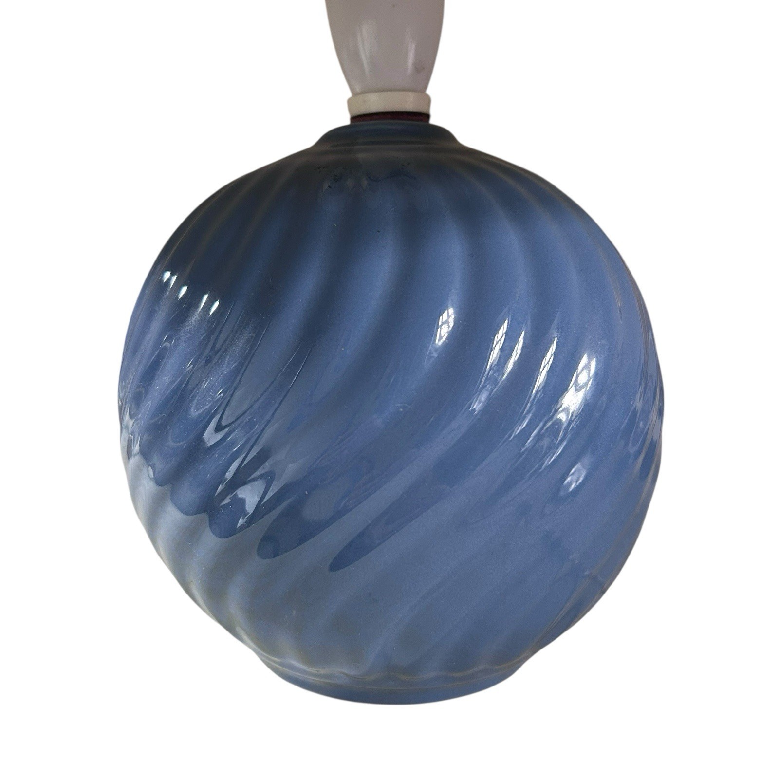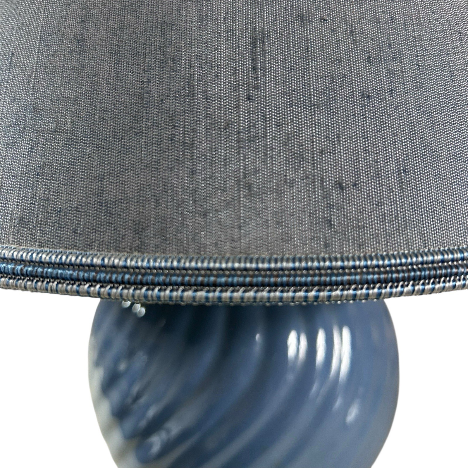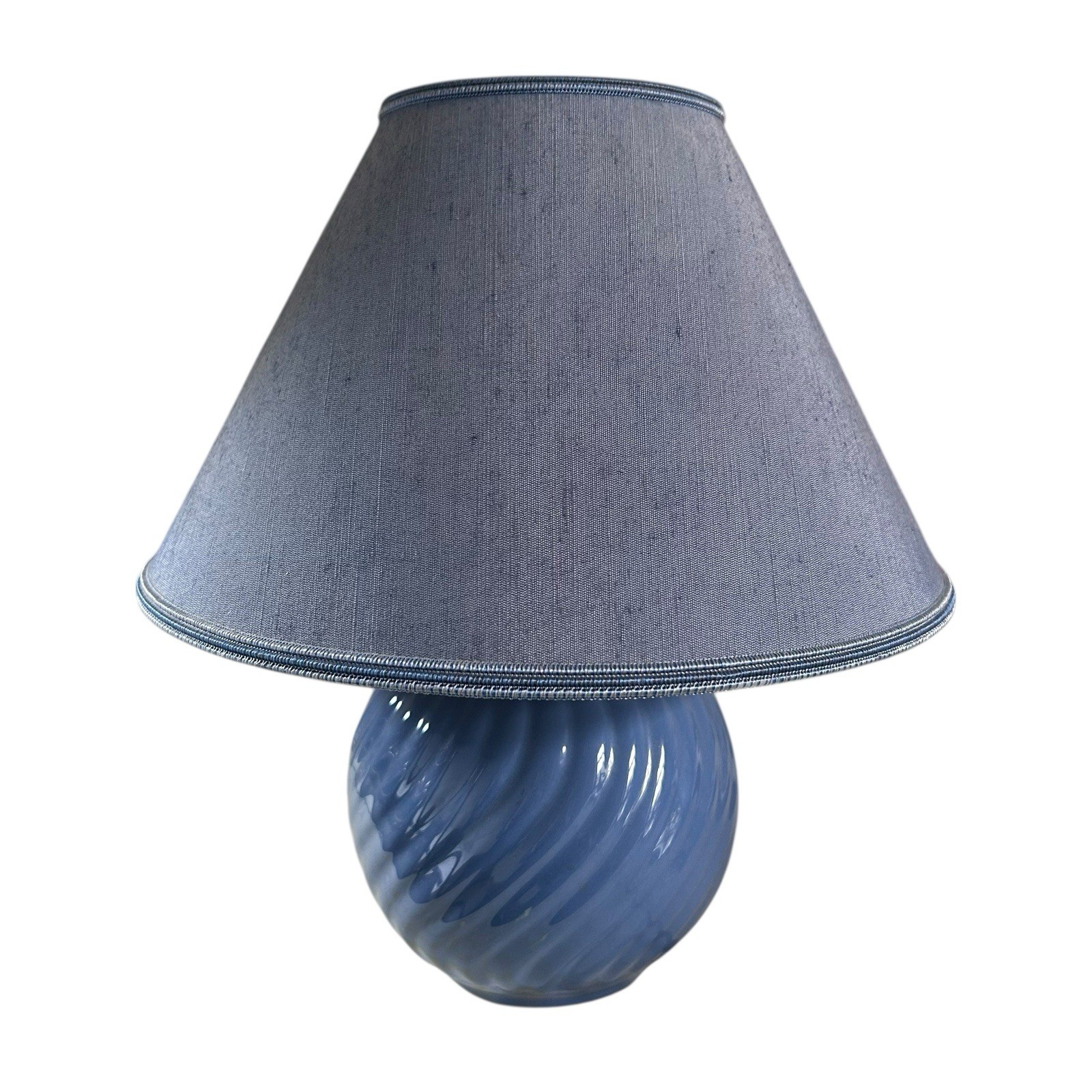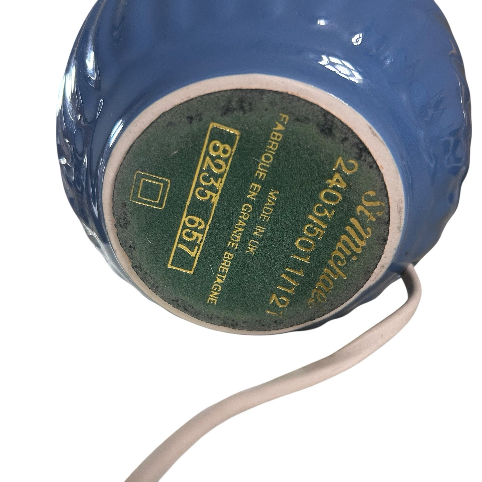 The base is ceramic, blue, with a swirl ribbed effect. The lampshade is also blue with blue trim. It takes 1 bayonet bulb (not included). There is a switch on the bulb housing so you can turn it on/off. The base has a felt covering to protect your surfaces. White wire with UK mains plug.