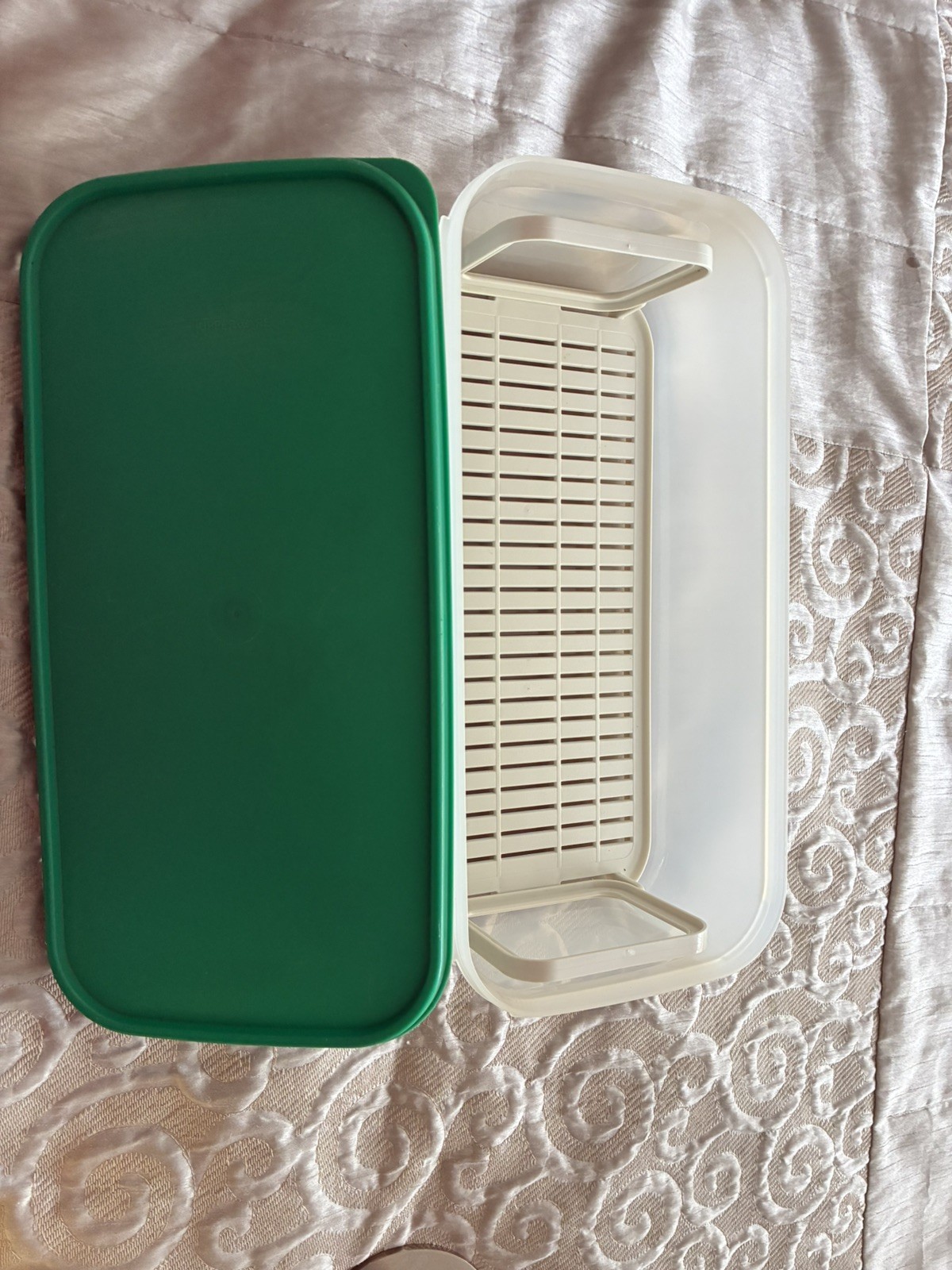 The Vintage Tupperware Vegetable Celery Keeper in Jadeite Green is a nostalgic addition to any kitchen collection. This medium-sized, rectangular storage box features a single compartment with a matching lid, perfect for storing salads or other vegetables. Made from durable plastic, this original Tupperware piece exudes a retro charm with its vintage style and colours from the 1970s. A free-standing storage solution, this salad container adds both functionality and a touch of vintage flair to your kitchen decor.