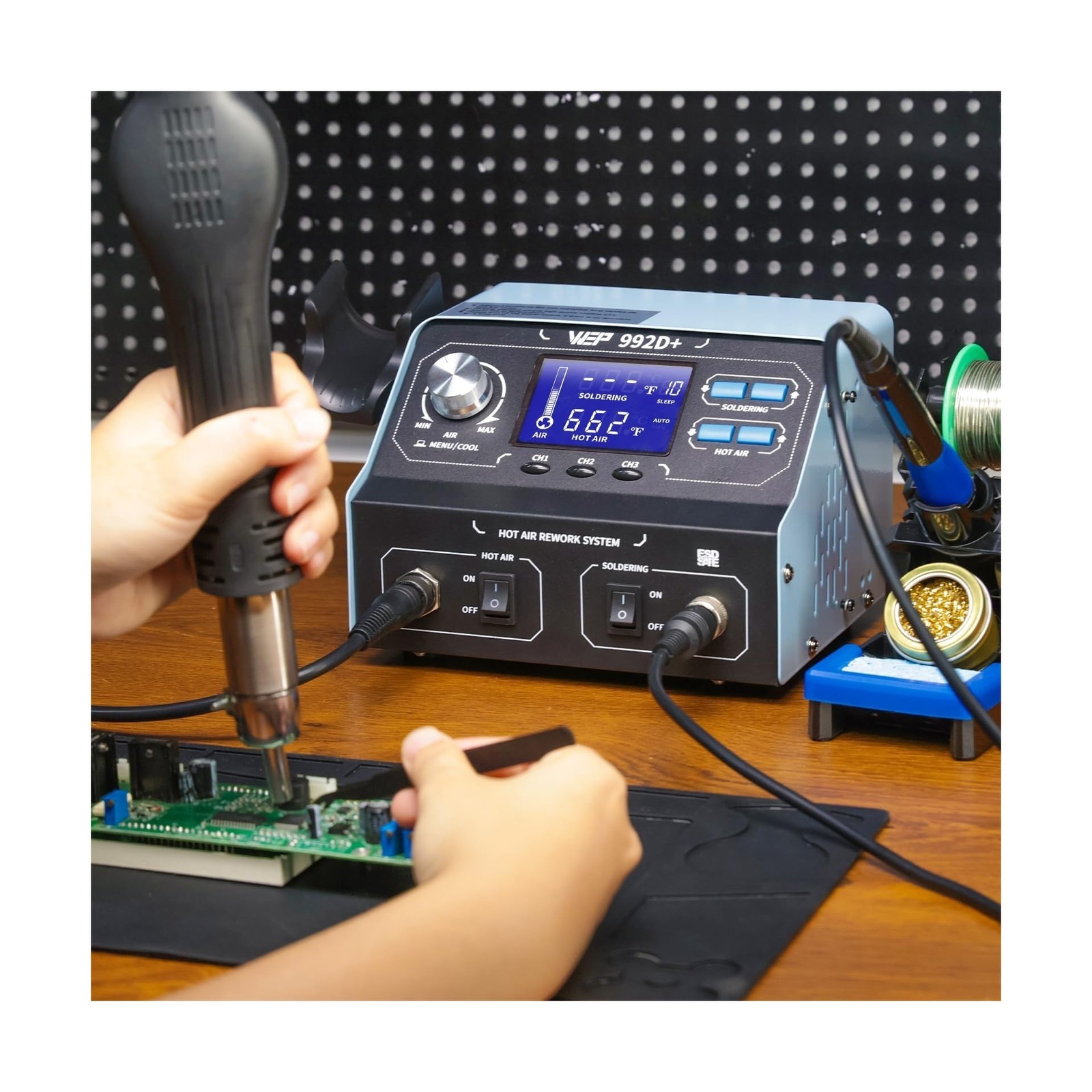 WEP 992D+ 2-in-1 Soldering Iron Kit and Hot Air Rework Station with 3 Preset Channels, LCD Display, Interchangeable Handles, Sleep Mode, X-2 Iron Holder, 5 Iron Tips, Desoldering Pump and Tweezers