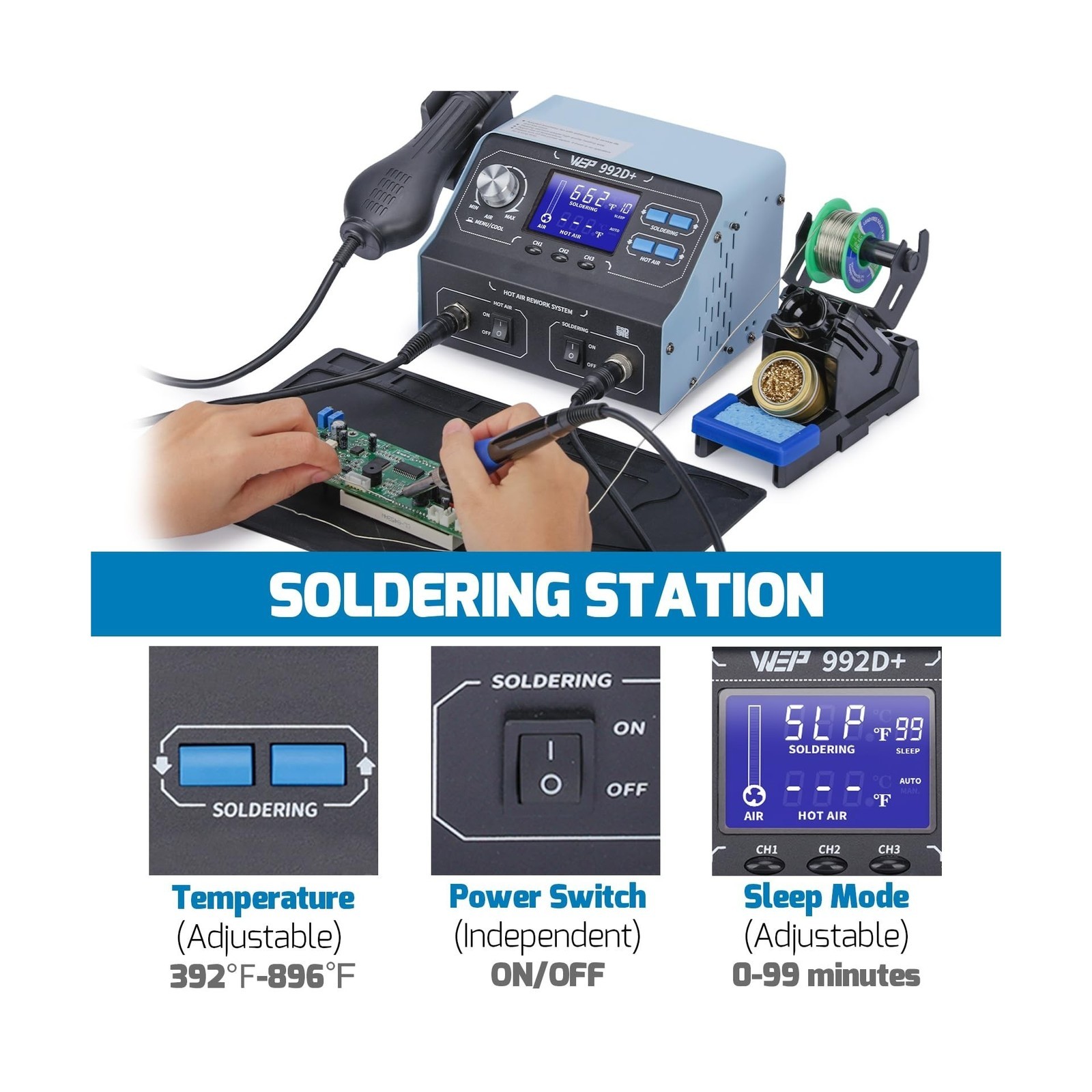 Soldering Station: Temperature range 392F-896F (200C-480C); supports sleep mode to minimize unnecessary wear; extends the lifespan of soldering iron tips and heating elements