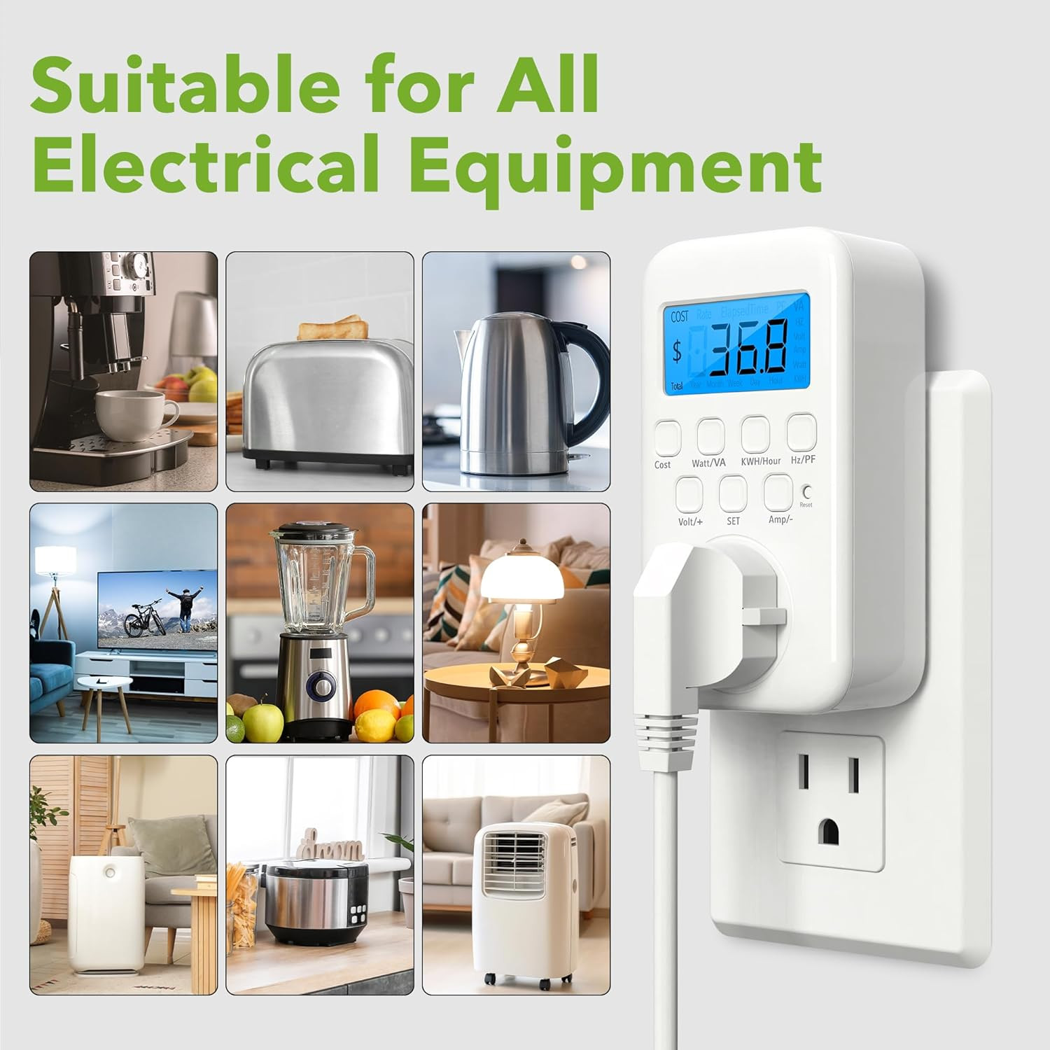 ✓ Save Money and Energy: By toggling through the 9 display modes, you can gain insights into various operational parameters of your devices. The home energy monitor also calculates and displays the electricity consumption and cost over time, helping you save on your electricity bills by monitoring and managing energy usage.