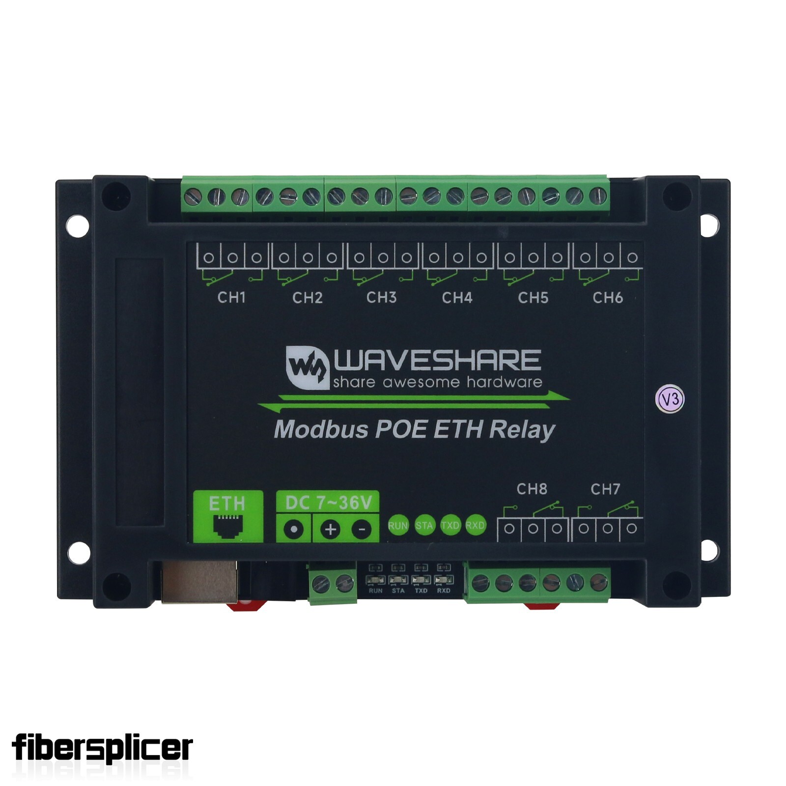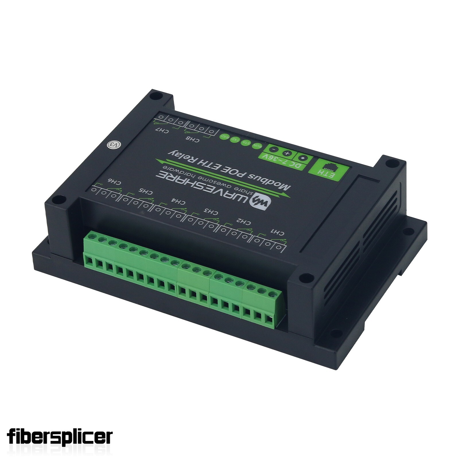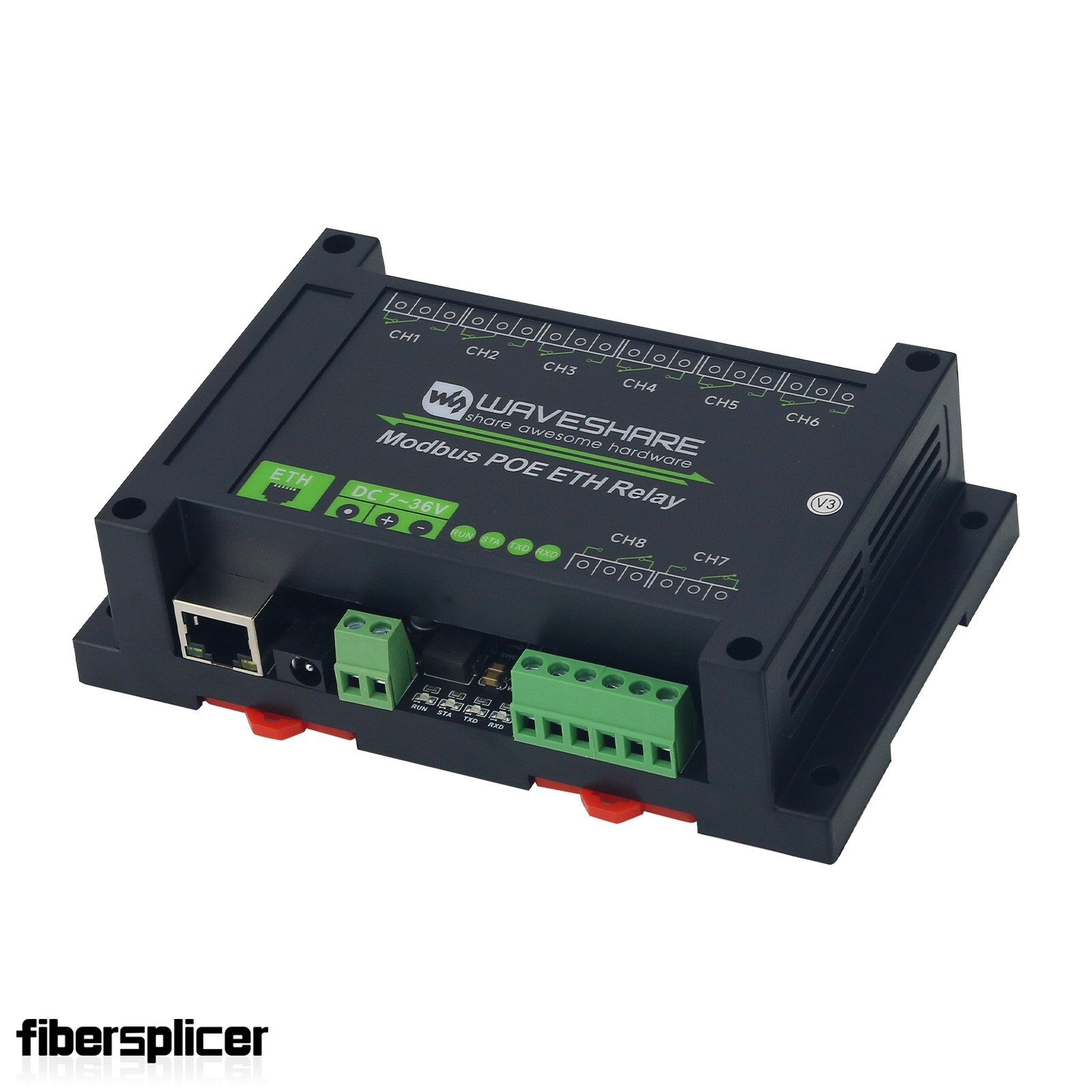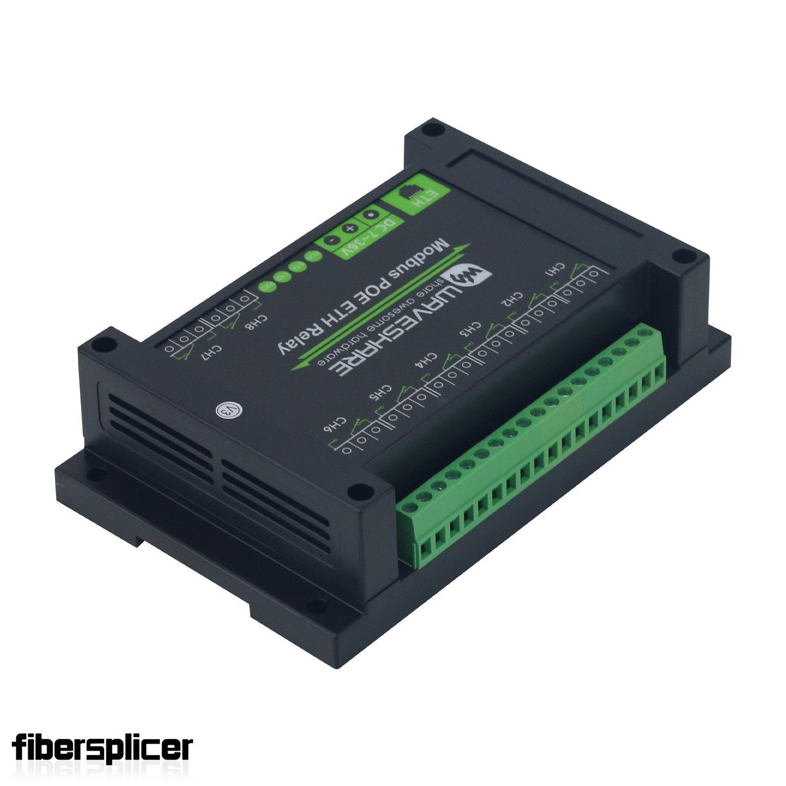 - This product is an industrial 8-ch relay module controlled via Ethernet port, adopts Modbus RTU/Modbus TCP protocols, supports PoE power supply, also comes with an ABS rail-mount case.