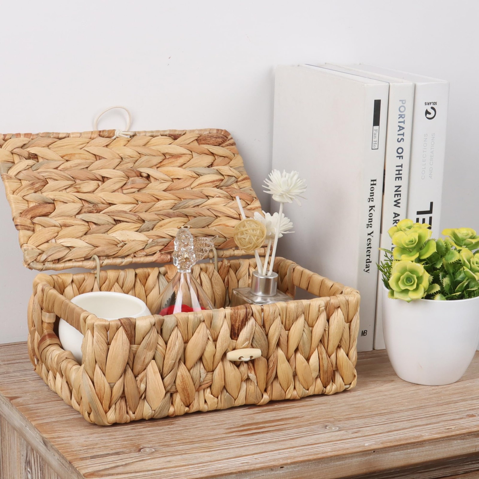Intimate Design: Shelf basket with handle can be easily moved anywhere in the home. Wicker basket with lid can keep the items in the basket clean and tidy. The decorative handle on the cover makes it easier to open and close the storage basket.