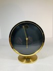 Slightly chipped on the top still working The product is a vintage Howard Miller desk clock with a brass construction and a quartz movement, making it a reliable timekeeping tool. The clock features a modern design with a gold color and a brass finish, adding a touch of elegance to any room. It is battery-operated for convenience and has an analog display, perfect for traditionalists who appreciate the classic look of a clock. This original Howard Miller clock is a timeless piece that would make a great addition to any vintage or modern decor.