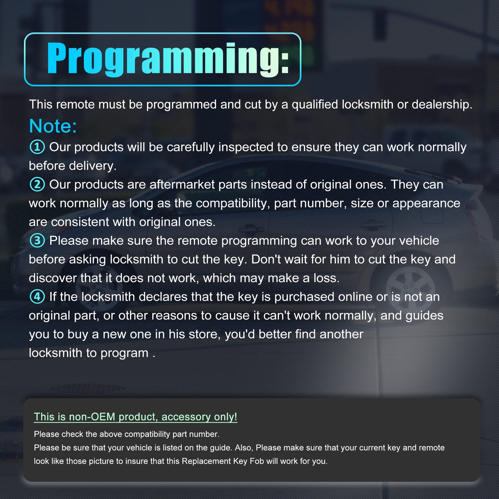 Feature: This is a non-OEM product, accessory only! Please check the above part number or FCC id with the current remote. Please be sure that your vehicle is listed on the fitment. Also, Please make sure that your current key and remote as same as those pictures to insure that this replacement key fob will work for you.