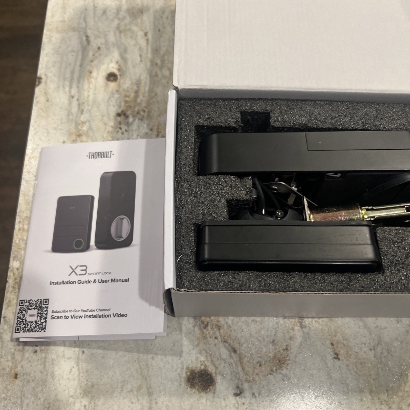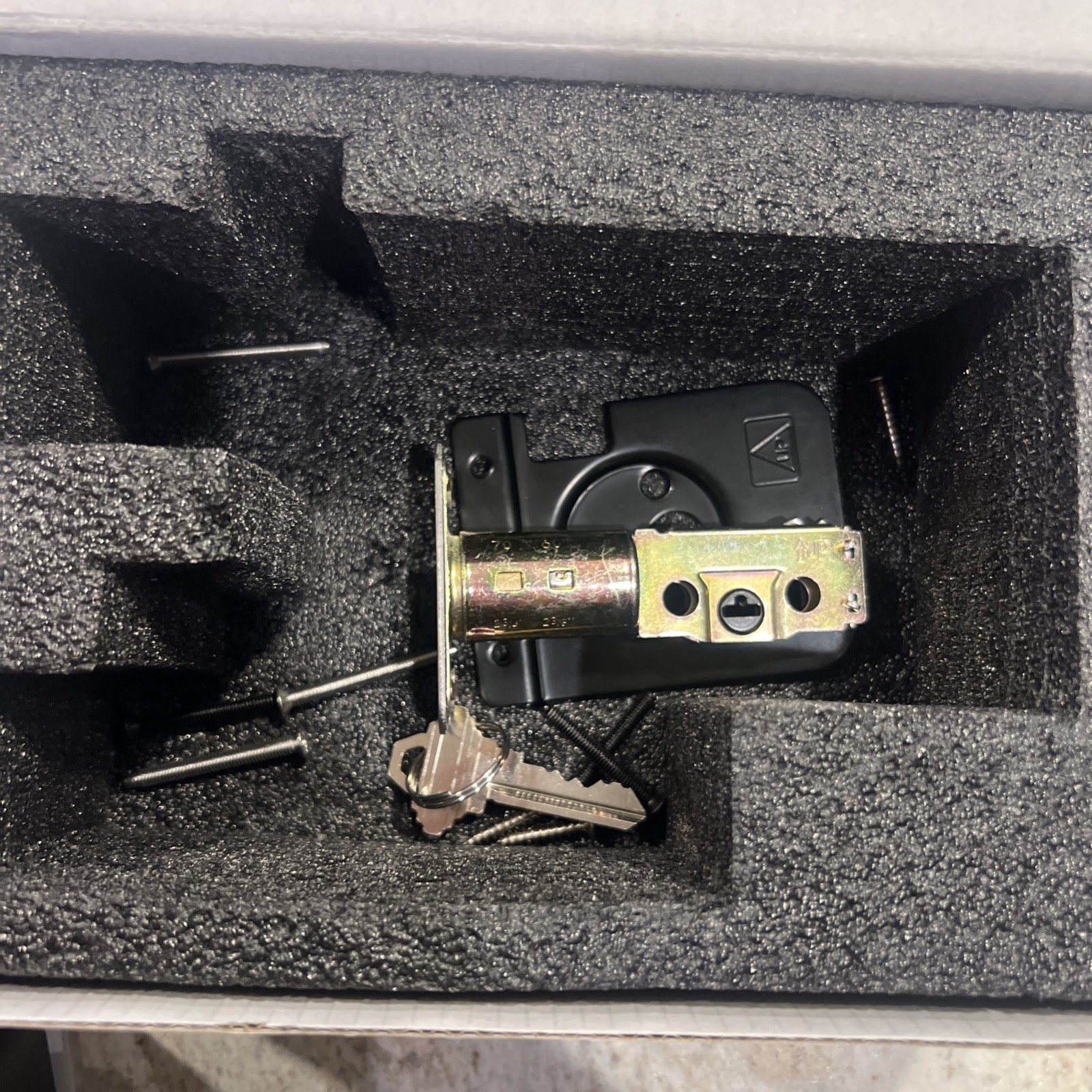 Open box. Gently used. Contains all items except two screws and one key. Includes instructions