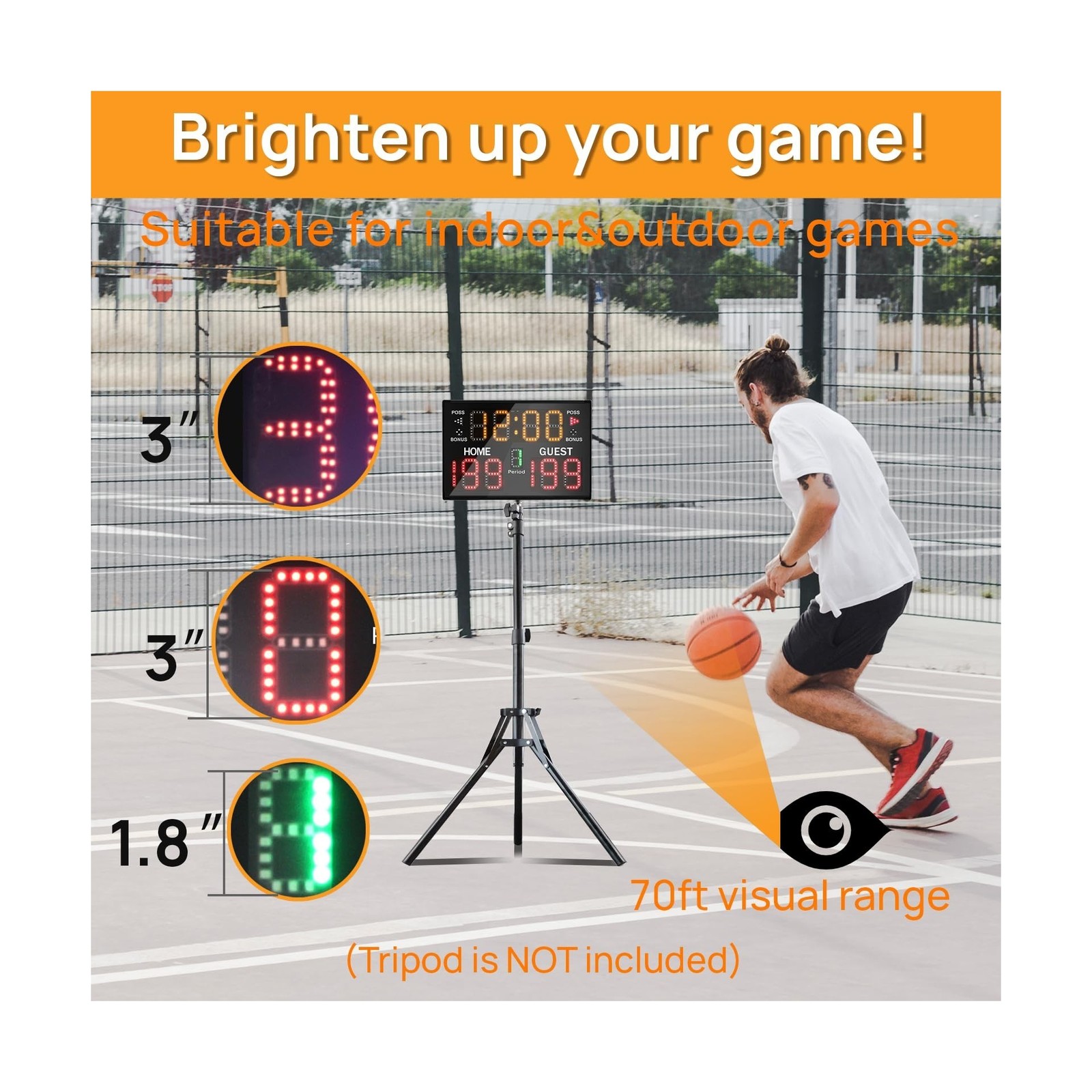 MULTIFUNTIONAL: Time+Score+Period+Poss+Bonus. Our electronic scoreboard are designed for most competitional games, basketball, football, volleyball, baseball and etc.