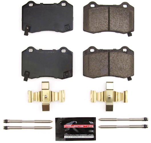 Powerstop Brake Pad Set -- The PowerStop Z23 Evolution Sport ceramic brake pads are designed as an upgrade over stock brakes to reduce brake dust & eliminate noise, so you can ride in comfort. These brake pads are made with a low-dust ceramic formula, infused with carbon-fiber for increased braking power without sacrificing everyday drivability. The necessary stainless-steel hardware along with ceramic brake lubricant is included with the Z23 brake pads making it easier to complete your brake job. Use Z23 Evolution Sport brake pads to give your daily-driver the stopping power it deserves.