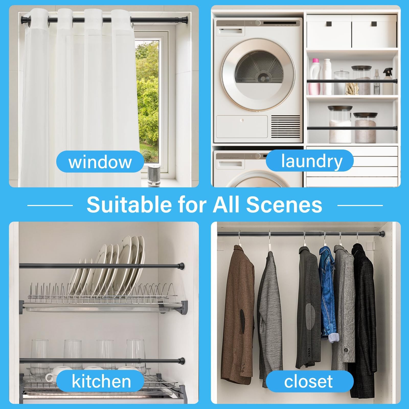 【Universal Compatibility】Excellently designed, this telescopic tension rod securely attaches to any surface, from smooth tiles to rough plaster walls, providing stable support wherever needed in your home.