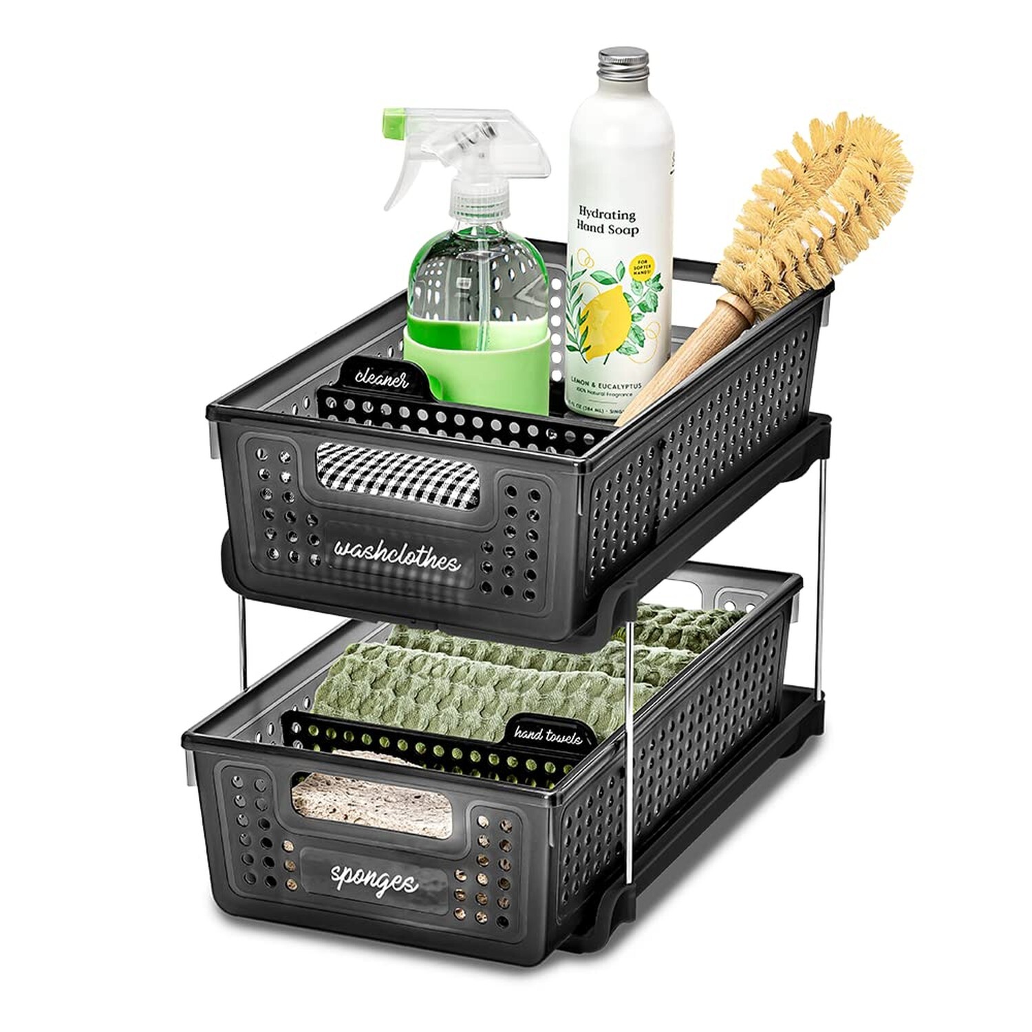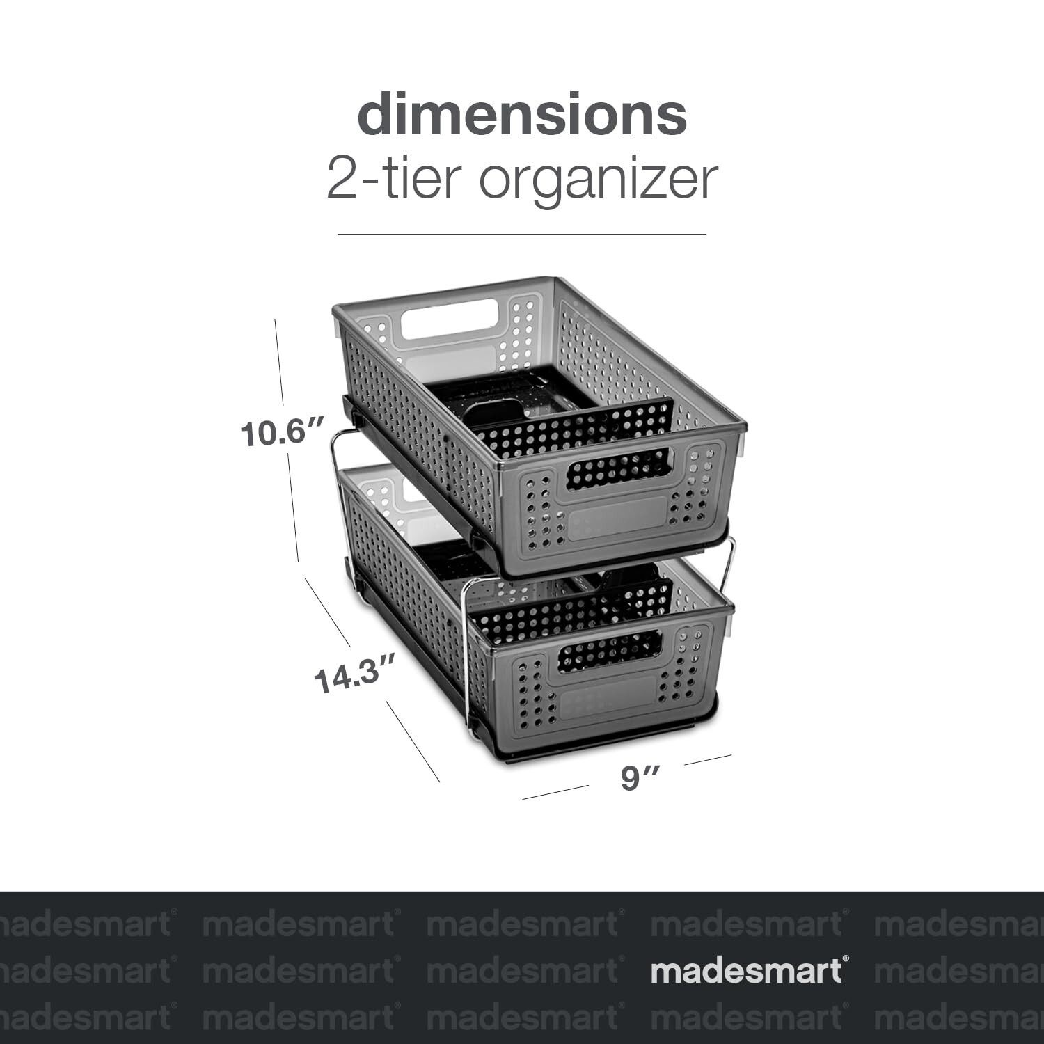 - The tiered design maximizes space with two removable storage baskets for easy access to items and two adjustable dividers for custom organization to separate all of your essentials