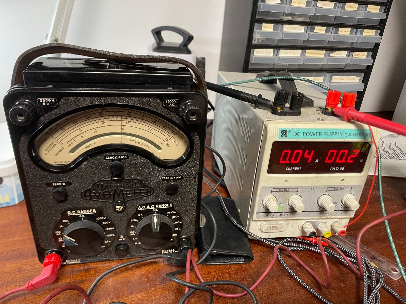 As you can see from the photos, the DC V and A ranges do work, Ohm seems to work but the battery is dying. One battery missing, the other is a replacement made from modern button cells (and is flat).