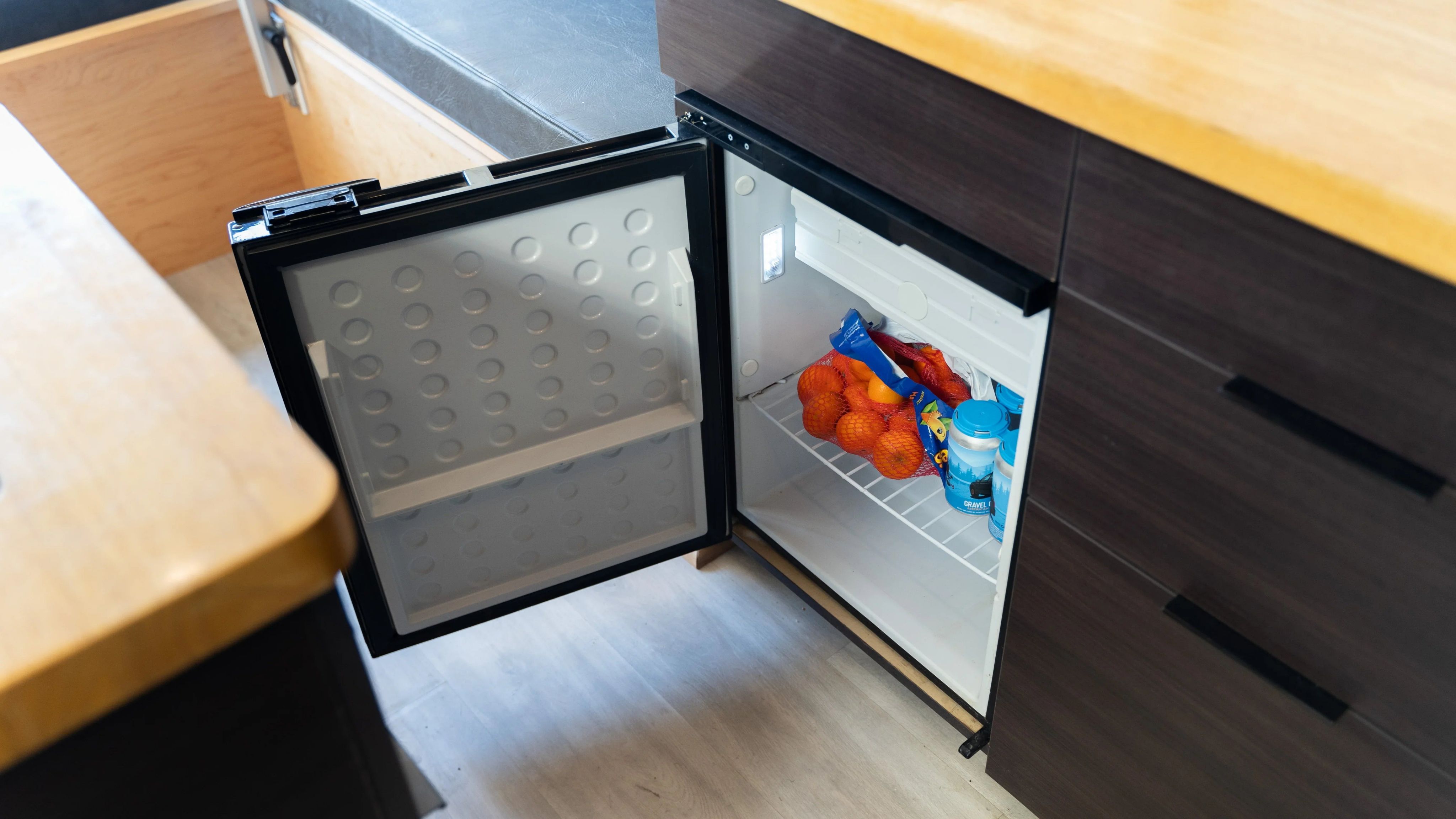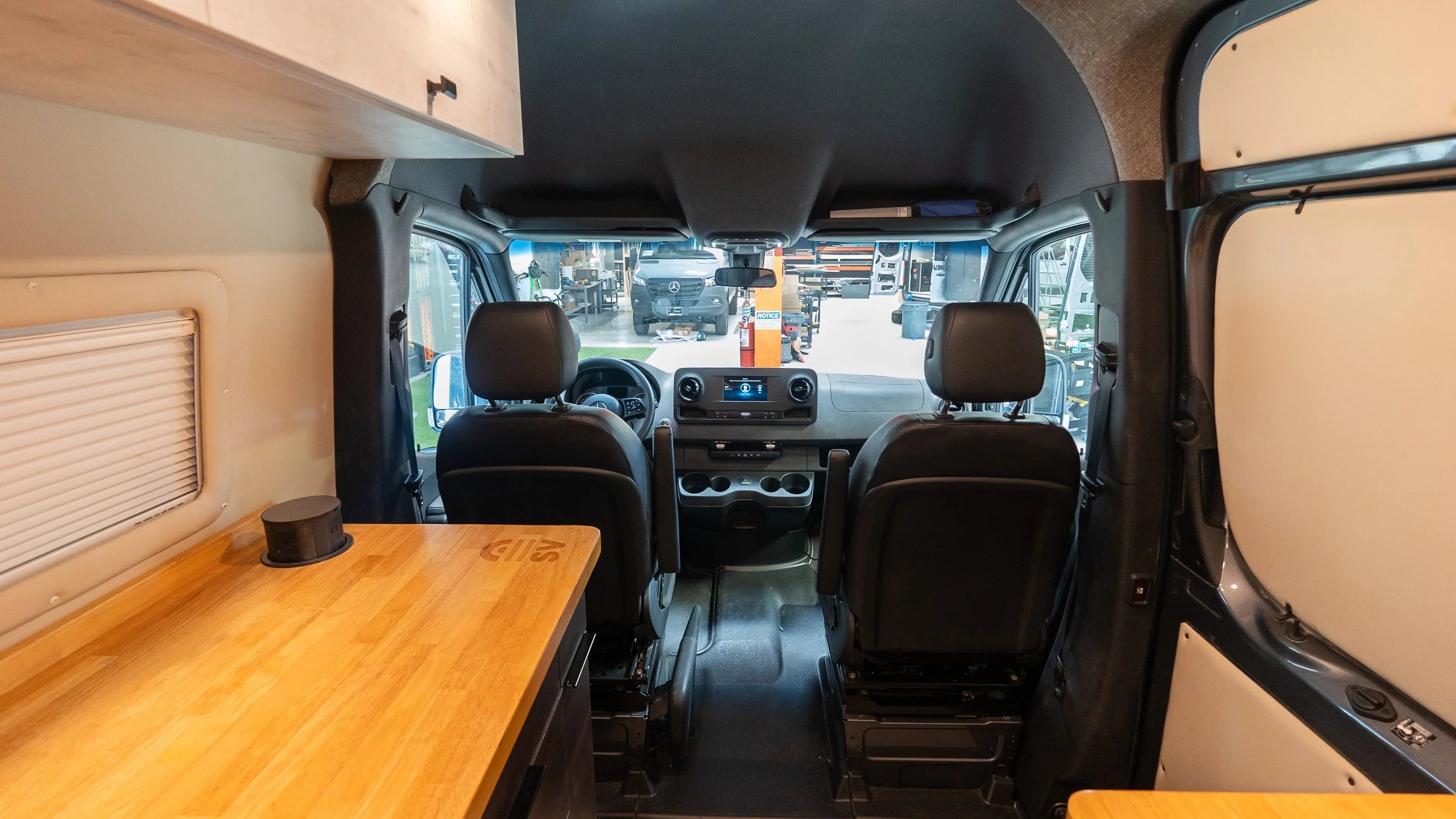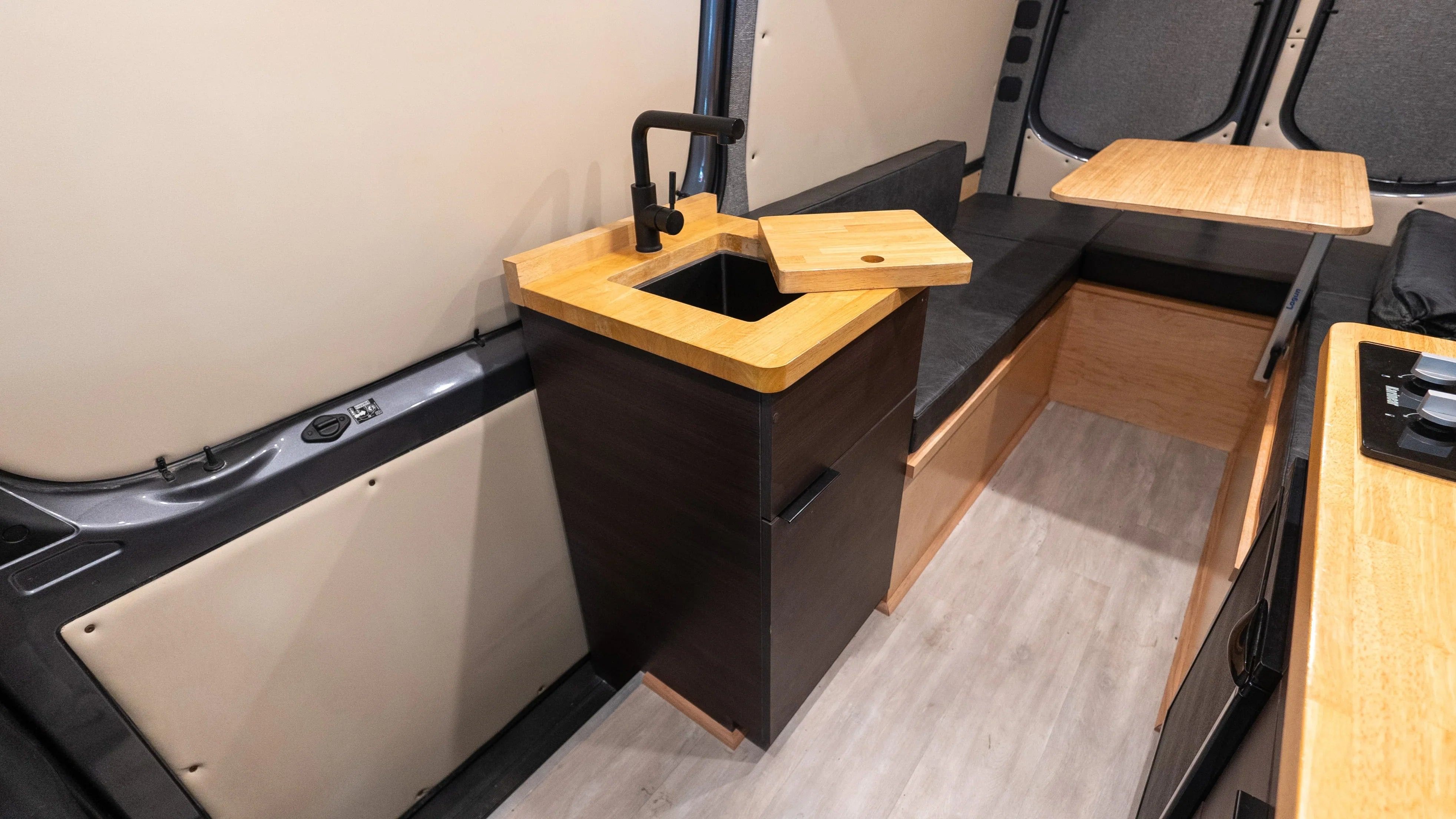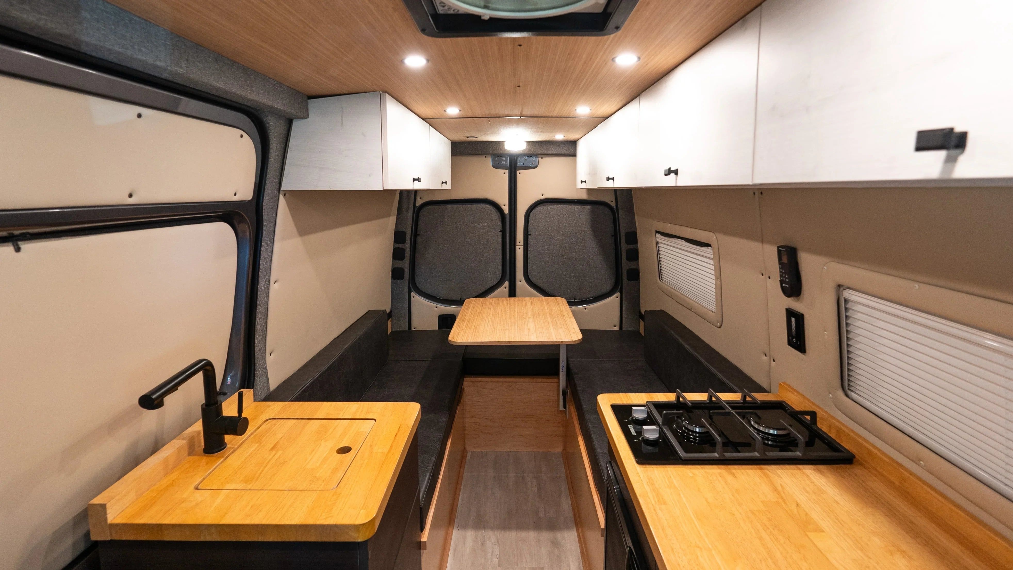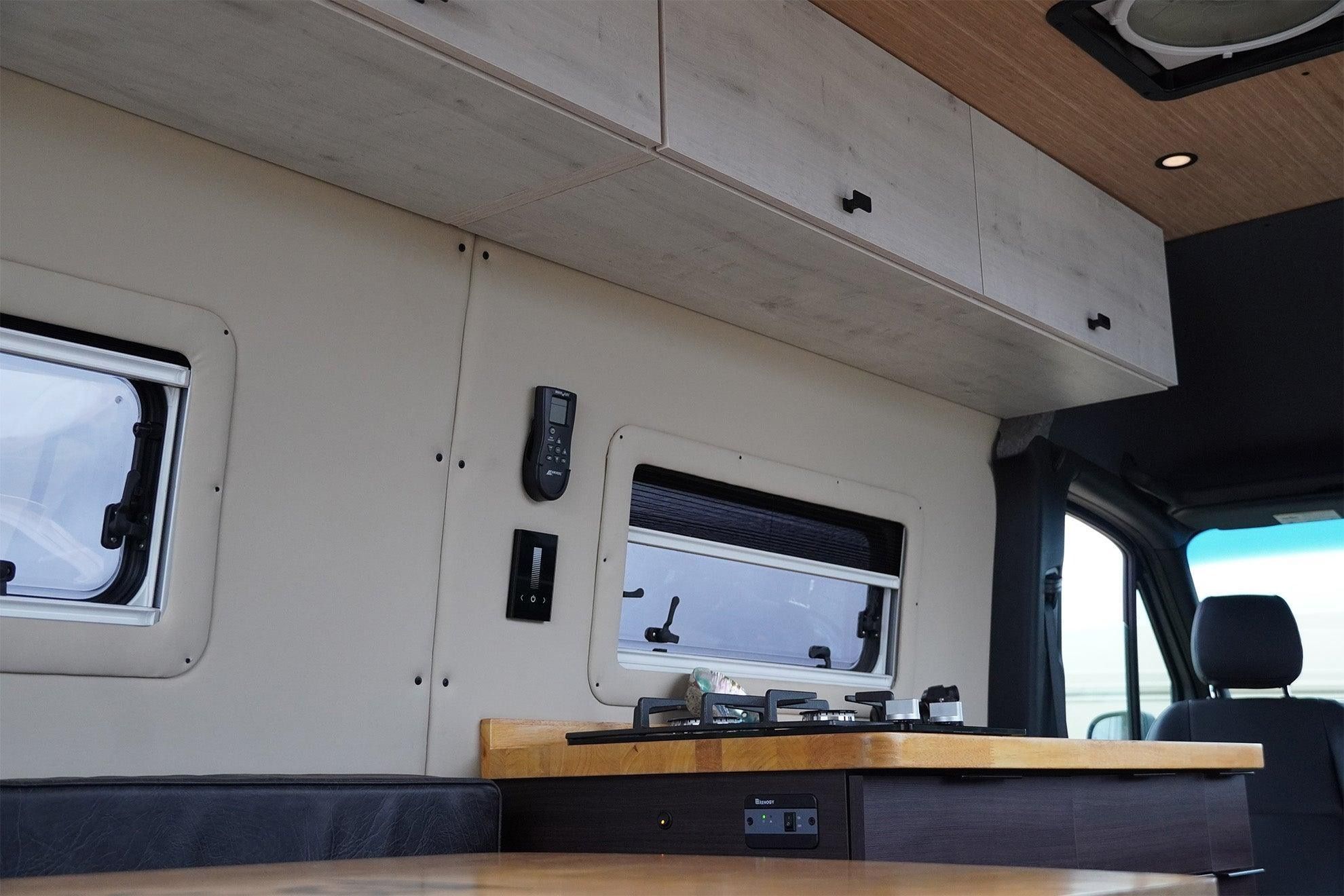 The Adventure awaits, time to gather your tribe in your new ride – Matthew McConaVan! This Sandy Vans layout offers a social setting, so nobody gets left behind. This Diesel Sprinter 144 build offers a spacious U shaped dinette featuring a custom laser etched Matthew McConaVan table finish which comfortably fits 6 for dinner and card games. As well as both front captain seats have factory swivels to allow the setting to be open and inviting. Plenty of storage provided by the upper cabinets and under the bench seats – this van has a spot for all the essentials! As the evening winds down the dinette easily converts to a bed stretching the width of the van and 75 inches length wise (in between a Queen & King size for reference). Roll out the mattress pad topper and viola, you have a roomy sleeping space for two (or more)! The driver side mounted windows open awning style to keep the breeze flowing even if it happens to be raining. Windows also offer build in screens & black out curtains.