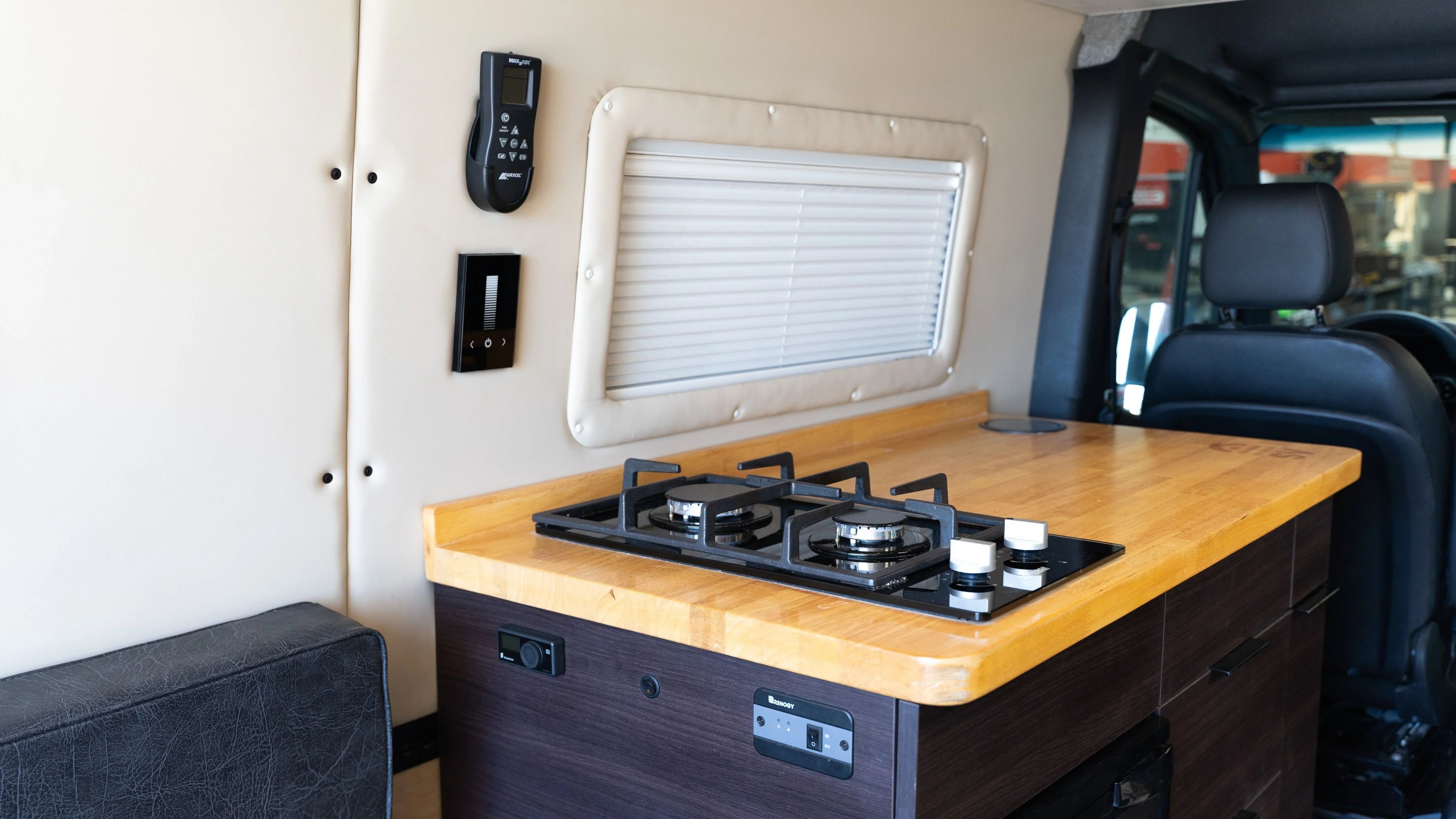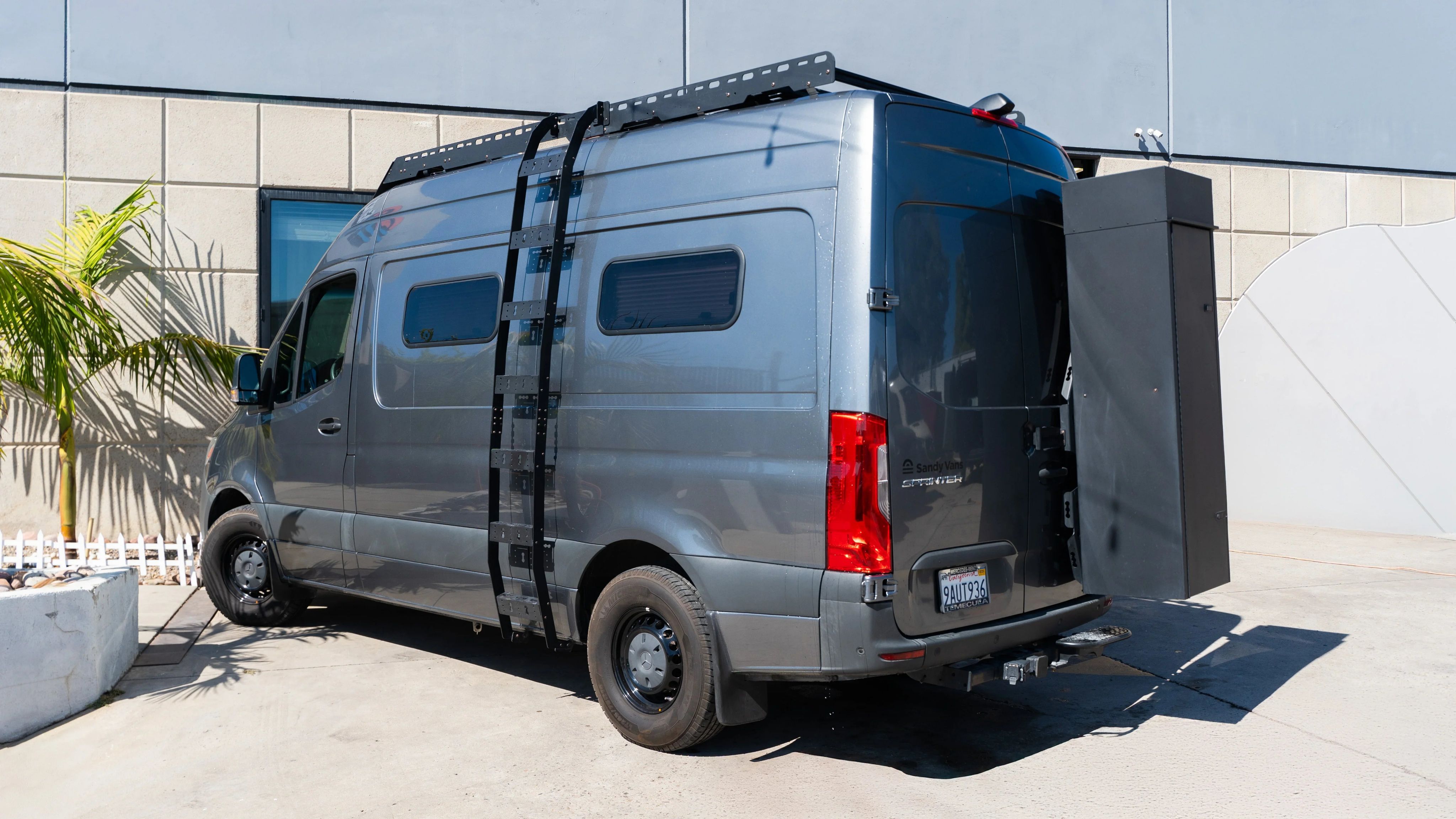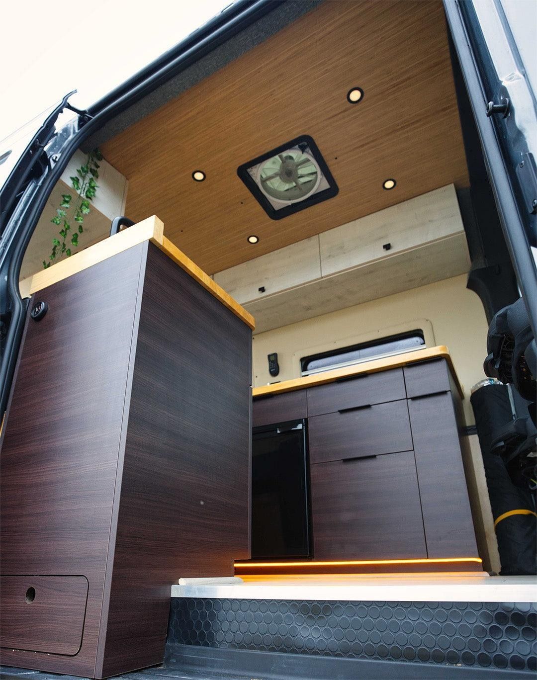 Equipped with a Renogy 200 AH lithium battery & 2000 watt inverter, power is not a problem. Renogy DC-DC charger installed so continuous charging while driving as well as the 175 watt Renogy Solar panel installed on the roof rack in front of the Max-air fan. With dimmable LED lighting, and an energy efficient 12v Alpicool refrigerator – this system will keep the van powered up for multiple days completely off the grid! Sandy Vans Roof Rack also offers additional storage on top of the rig.