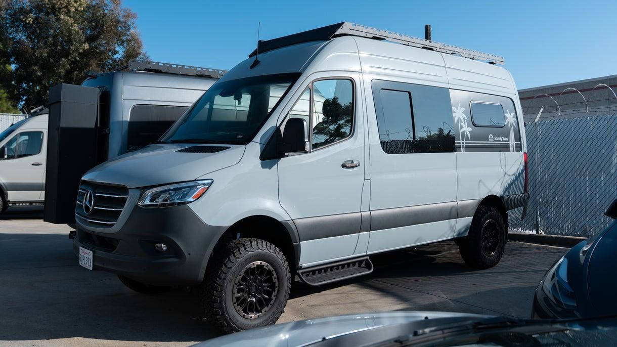 Outside, the Sandy Vans roof rack and SV side ladder expand your storage options, complete with a rooftop deck. The fully L-track-compatible setup allows you to mount extra gear like recovery boards, fuel cans, or adventure essentials. SV Canyon wheels paired with BFG KO3 all-terrain tires give AquaVan confident traction for wherever the road turns.
