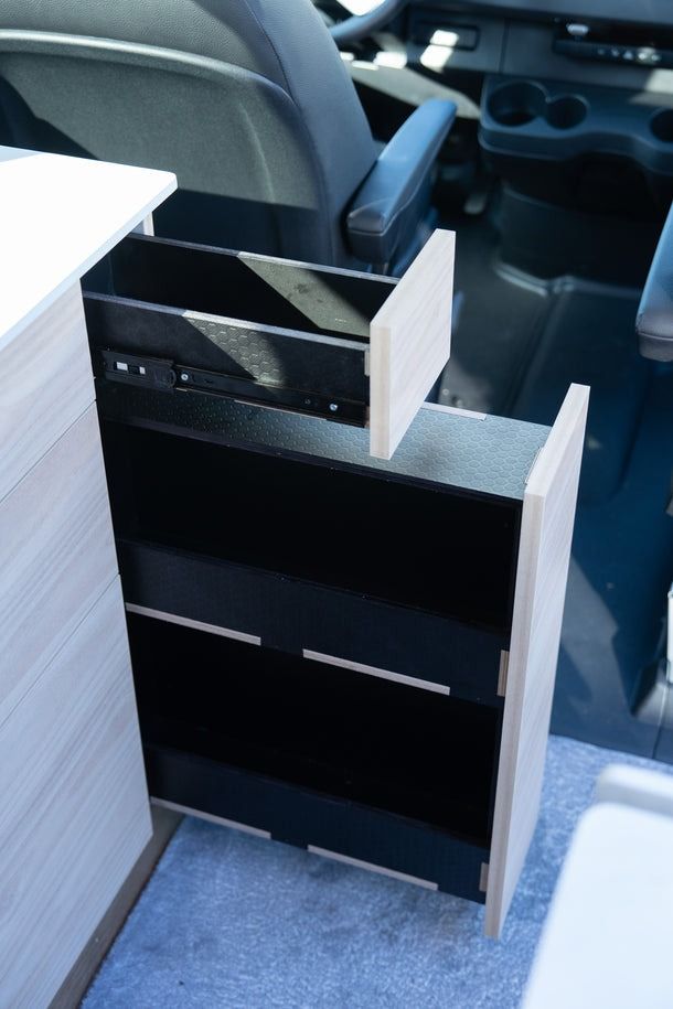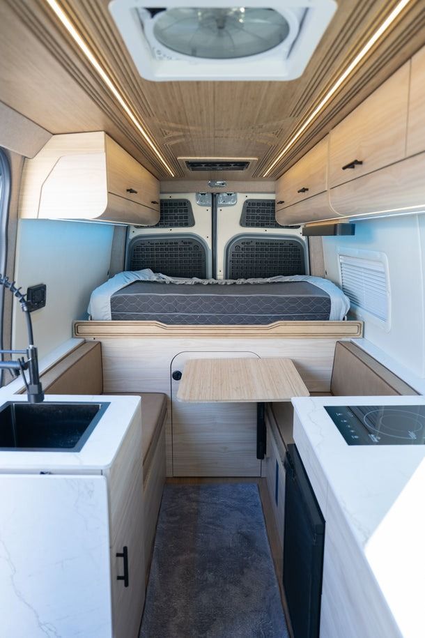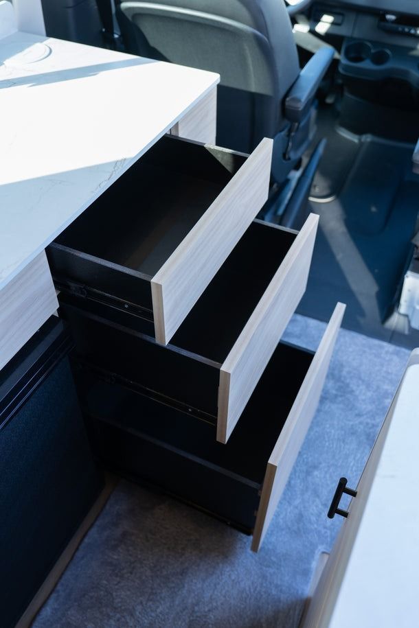 Designed for easy living on the road, AquaVan delivers the best of both worlds: a full dinette for meals, work, or downtime, plus a pull-out queen bed that slides seamlessly into place. Sleep north–south, stretch out comfortably, and still have space to settle in when the day winds down.