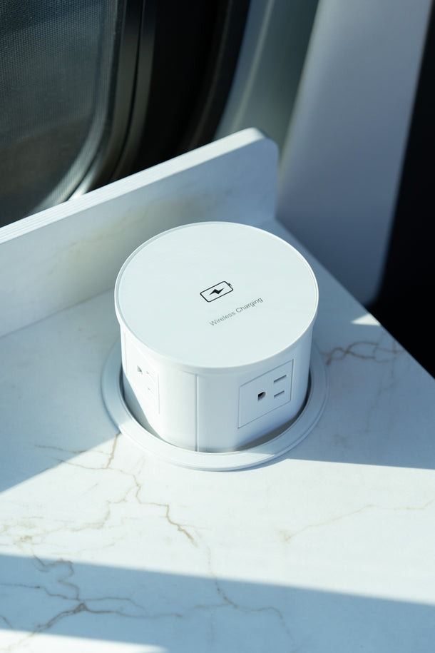 Triple-charge capability (solar, shore power, and alternator charging while driving) means AquaVan stays powered whether you’re posted up by the coast, exploring Baja, or heading into the mountains.